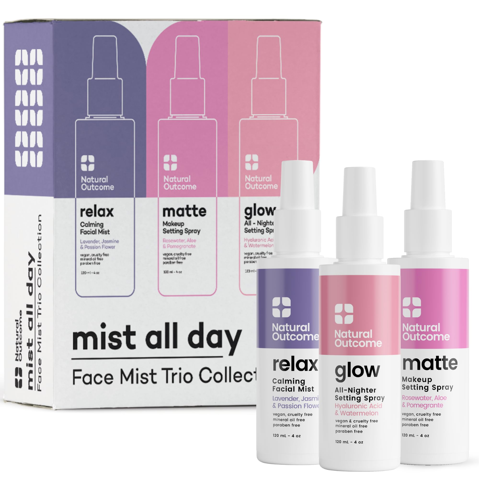 Refresh, hydrate, and elevate your skincare game with our Face Mist Trio Collection—a luxurious set of three facial sprays designed to suit every mood, moment, and skin need. Whether you're setting makeup, soothing stressed skin, or adding a dewy glow, these versatile mists deliver instant results and long-term benefits. Each formula is thoughtfully crafted with nourishing ingredients like hyaluronic acid, rosewater, lavender oil, and botanical extracts to provide deep hydration and sensory indulgence. The Glow All Nighter Mist delivers luminous moisture for a radiant finish, the Matte Setting Spray controls shine for a smooth, natural look, and the Calming Facial Mist brings balance and relaxation to both skin and mind. Lightweight and portable, this collection is perfect for travel, gym bags, or daily touch-ups. It's more than a spray hidratante para la cara—it's your on-the-go skincare ritual. Whether you're looking for the best hydrating face mist or a gentle refresher to rival favorites like the Evian face spray or Curel face mist, this trio is your new everyday essential.Portable Face Spray Mist Trio – Travel-Friendly Skincare: Compact, easy to apply, and TSA-approved, this facial mist spray hydration set fits right in your bag. Use it anytime to revive skin, refresh makeup, or indulge in a quick self-care moment. Soothing Lavender Mist for Calming Hydration: Relax and reset your skin anytime with this hydrating face spray mist for dry skin. Lavender oil and jasmine extract offer instant refreshment—perfect as a face mist for women who want a little peace on the go. Glow All Nighter Mist with Hyaluronic Acid Watermelon: Hydrate and illuminate with our radiance-boosting moisturizer mist for face. Infused with hyaluronic acid and watermelon extract, this setting spray locks in moisture and enhances your makeup with a dewy, long-lasting glow. Matte Setting Face Mist with Rosewater Aloe: Control excess shine and enjoy a flawless finish with our hydrating mist powered by rosewater, aloe vera, and pomegranate. Ideal for oily or combination skin, it sets makeup while keeping skin comfortably matte. Hydrating Facial Mist Spray for Every Skin Need: This trio of face mists includes a matte, dewy, and calming option—perfect for setting makeup or refreshing skin throughout the day. Whether you need oil control, glow, or a moment of calm, we've got your skin covered.