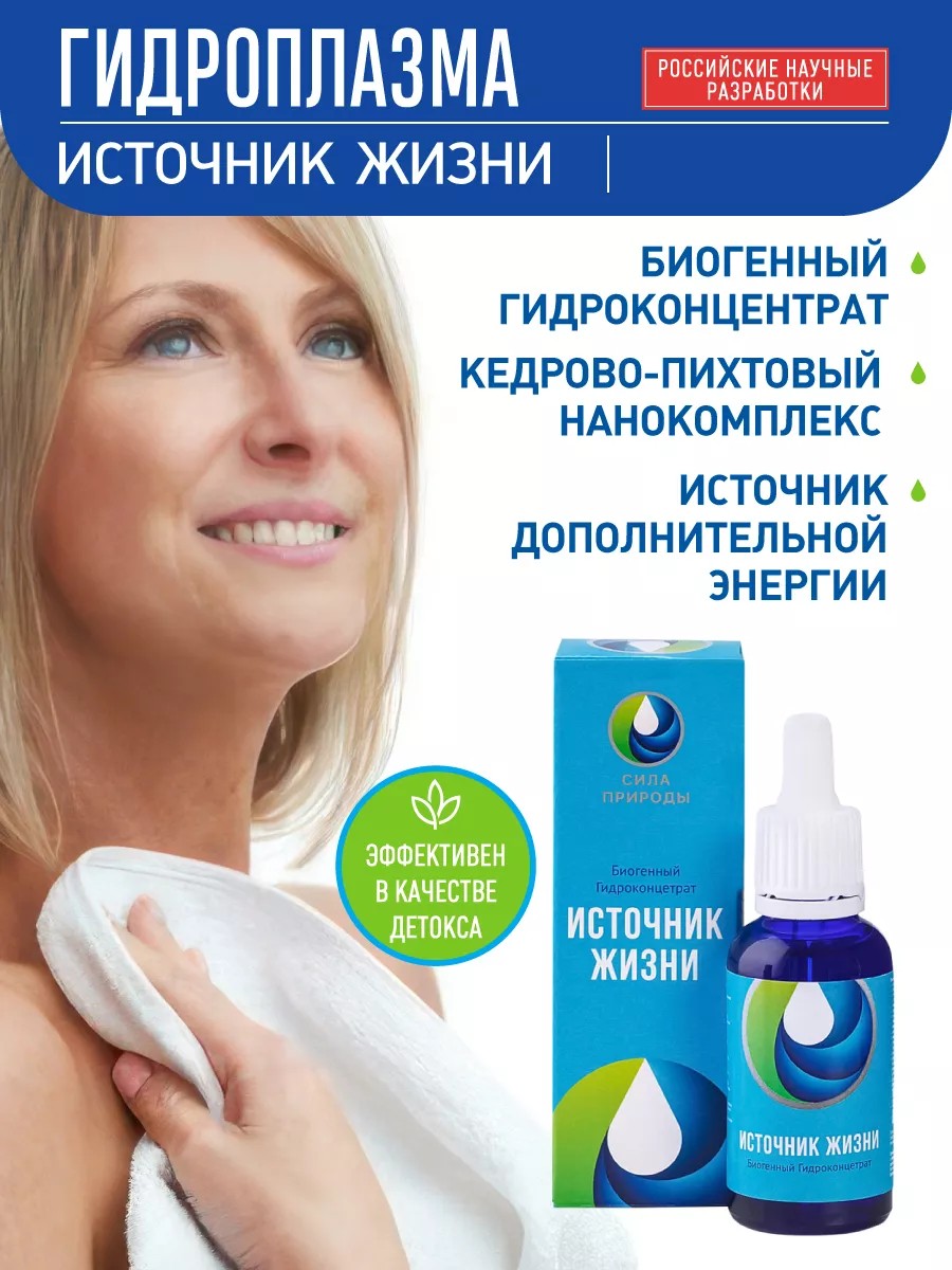 Гидроплазма "Источник жизни" - это концентрат для приготовления биогенной (живой) воды. Это не лекарство, это живой продукт! Благодаря удивительным качествам гидроконцентрат дает мощное действие, бодрость, жизненную активность, замедлят процессы старения организма и способствует его регенерации. Биофизики Казахстана под руководством профессора В.М. Инюшина в результате двадцатилетних исследований сделали невероятное открытие: в природной биогенной, полезной для биологических организмов, воде обнаружили существование в небольших количествах особого вещества - плазмы (свободных комплексов из несвязанных в атомы и молекулы частиц), которая получила название гидроплазма. Гидроплазма "Источник жизни" имеет очень большую плотность частиц, а значит и огромную свободную энергию, которая может противостоять деградации воды, возникающей под воздействием внешних негативных факторов окружающей среды и дать человеку колоссальный ресурс энергии для молодости, здоровья и долголетия! Гидроплазма не имеет химические компоненты, она представляет собой биологически активный концентрат, предназначенный для разбавления питьевой воды. Уникальная по своему молекулярному составу, гидроплазма полностью растворяется в воде и делает ее максимально полезной, обеспечивая активацию внутренних сил организма каждого человека. Полученная в домашних условиях биогенная вода способствует детоксикации организма и очищению тканей и внутренних органов, выведению шлаков и токсинов, канцерогенов. Благодаря регулярному приему инновационного продукта, в организме запускаются процессы самовосстановления и омоложения на клеточном уровне, не прекращающиеся длительное время. Комплексное воздействие обеспечивается полным растворением гидроплазмы в воде и проникновению во все клетки и органы человека, благодаря естественному процессу кроветока. Изменения происходят на уровне ДНК, благодаря чему человек выглядит моложе и становится активнее, стабилизируется его нервная система и наблюдается полноценное восстановление энергетических запасов.