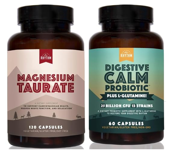BETTER DIGESTION: Digestive Calm Probiotic helps restore the stomach's natural rhythm and balance caused by the modern diet and unhealthy food. ANTI-INFLAMATORY: Magnesium taurate contains an amino acid called taurine, which has a calming, neuroprotective effect in the brain. HEART HEALTHY FORMULA: Low levels of magnesium can multiple health issues supplementing with Magnesium Taurate can be beneficial in promoting increased health and wellness. ONLY THE FINEST INGREDIENTS: Our products are meticulously crafted with high-quality ingredients. It stands as a gluten-free, sugar-free, vegetarian, non-GMO supplement, free from yeast, soy, artificial colors, or flavorings—an exemplar of uncompromising quality and purity. RESTORE YOUR NATURAL RHYTHM: Naturally boost your immune system to improve the quality of life. We, at Natural Rhythm want to help you to return to your natural, calm, healthy rhythm of life in simple and sustainable ways.
