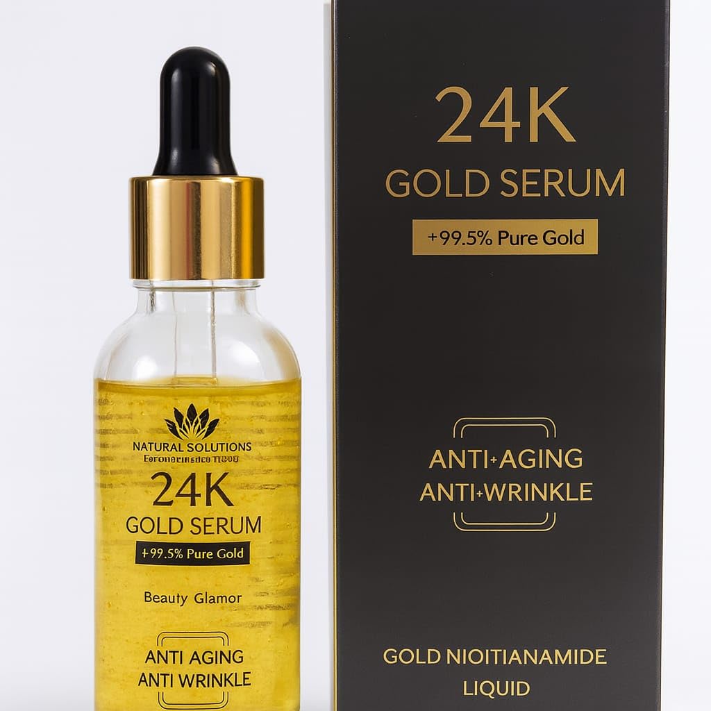 This luxurious 24K Gold Serum from Natural Solutions combines the timeless allure of pure gold with advanced skincare science to deliver powerful anti-aging benefits. Formulated with 99.5 pure gold particles, this premium face serum works to combat visible signs of aging while promoting a radiant, youthful complexion. The gold niacinamide liquid formula penetrates deeply to target fine lines and wrinkles, helping to smooth and firm the skin's appearance. Gold has been treasured for centuries in beauty rituals, and this serum harnesses its properties to enhance your skincare routine. The lightweight liquid texture absorbs quickly without leaving a greasy residue, making it suitable for daily use. Simply apply a few drops to cleansed skin and gently massage in circular motions, allowing the serum to work its magic. The elegant dropper bottle ensures precise application and maintains product freshness. Whether you're looking to address early signs of aging or maintain your skin's youthful glow, this Beauty Glamor serum offers a touch of luxury to your daily regimen. Experience the transformative power of gold-infused skincare and reveal smoother, more luminous skin. NOTE: OUR BOTTLES HAVE A SMALL GAP ON TOP TO LET PRODUCT BREATH AND PREVENT SPILLAGE