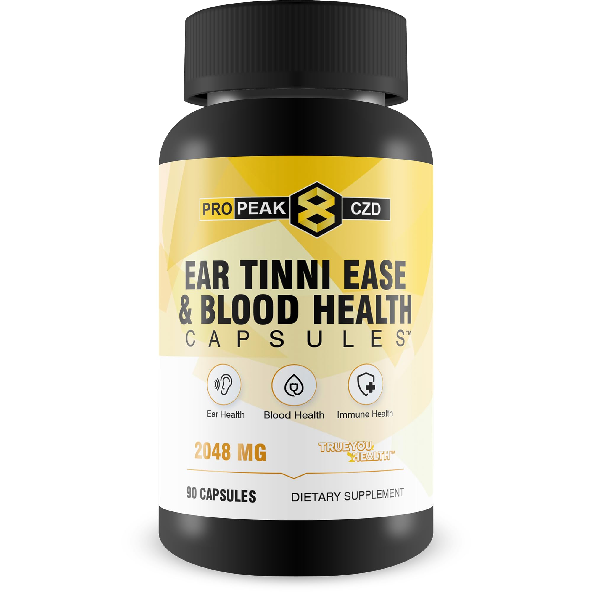 Made in the USA - Our clear tinnitus supplement is manufactured in the United States, adhering to strict quality standards to ensure the quality, safety, and efficacy while supporting local businesses. Natural Ear Hearing Health Support - Promote optimal ear and hearing health with our tinnitus supplements, which contain nutrients and botanicals specifically chosen to help nourish the delicate structures of the ear and support auditory function. Aid Blood Circulation - Promote improved blood flow with our capsules, which supports overall health and healthy circulation to the ears, helping to reduce the intensity and frequency of ringing in ears. Comprehensive Support - Experience a thorough approach to well-being with our capsules, which not only target ringing ears but also provides blood health support, immune support, and aids in reducing whole body swelling for holistic relief. Advanced Tinnitus Relief Formula - Pro Peak 8 CZD Ear Tinni Ease Blood Health Capsules feature a meticulously engineered blend of vitamins, minerals, antioxidants, and herbal extracts for tinnitus ear ringing relief support.