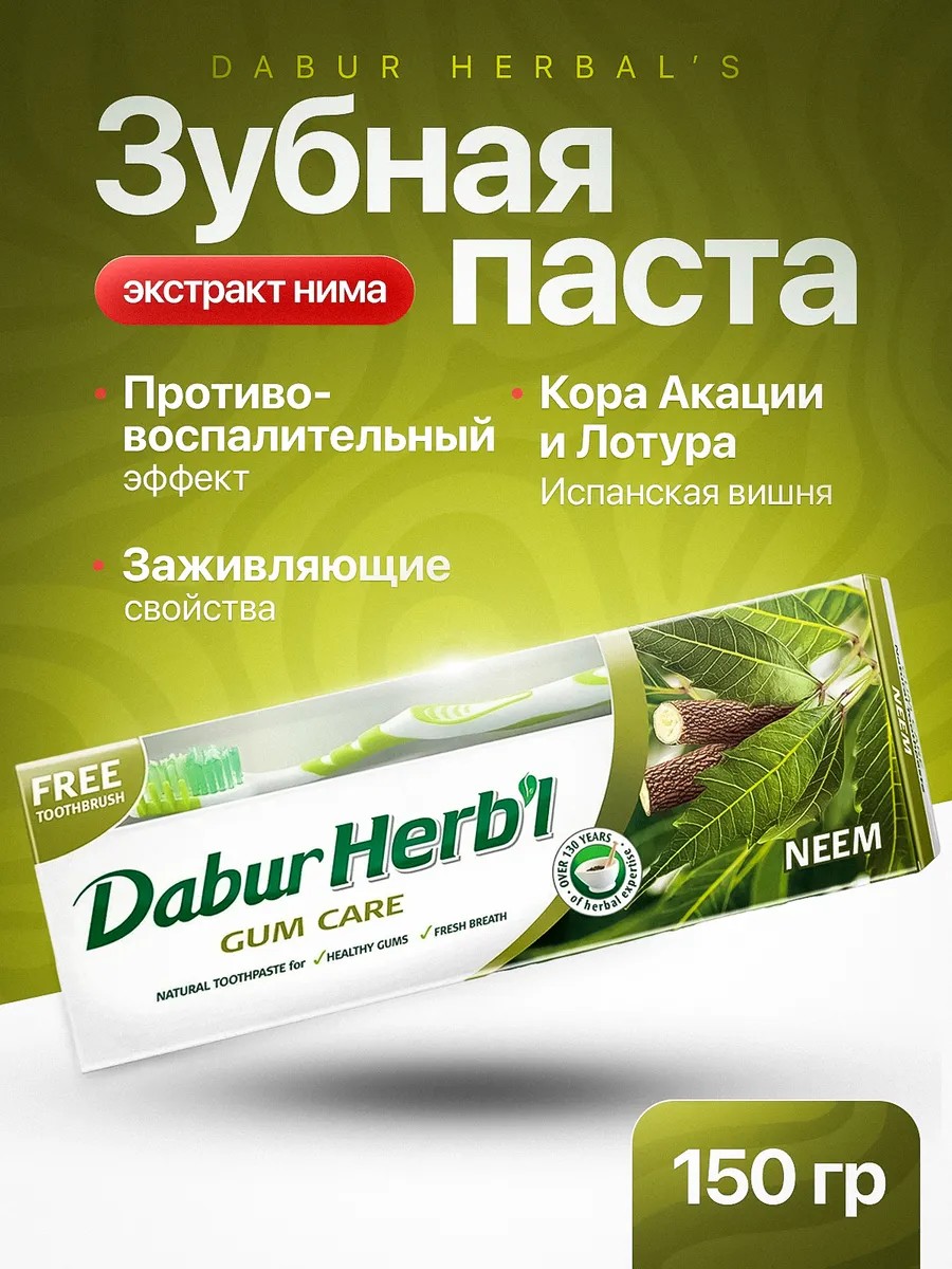 Зубная паста Dabur Herb Neem Ним Дабур является универсальным средством для защиты здоровья зубов и дёсен. Не содержит фтор. Она сочетает в себе природные антибактериальные свойства нима и других лекарственных трав для обеспечения уникального эффекта ухода за полостью рта.
