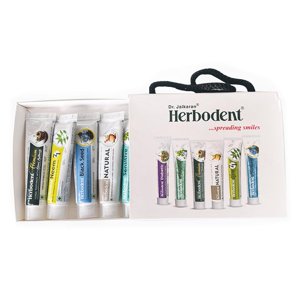 Herbodent NEEM 7 in 1 Toothpaste-Organic Herbs-Neem, Black Seed Xylitol for Anti Cavity-Cardamom Mint for Taste Freshness-Baking Soda for Excellent Cleaning.. 0.53 oz. Herbodent Diabetic - A Toothpaste specially crafted for Diabetics SLS SUGAR FREE Formula 7 Organic Herbs - Jamun, Fenugreek, Bitter Gourd, Madhunashini, Black Seed Neem.. 0.53 oz. Herbodent Blackeed Toothpaste with Natural Particles THYMOQUINONE Improves Micro-Hardness Level of Enamel Sensitivity Cavities Protection 7 Organic Herbs.. 0.53 oz. Herbodent Sensitive Toothpaste for Enamel Repair Cavity Protection, Fluoride Free, Sensitive Care with Natural Mouthwash Gum Strengthening Herbs - Clove, Tomar more.. 0.53 oz. Herbodent Premium Toothpaste - A Unique Blend of 21 Herbs Like Neem, Clove, Cinnamon, Cardamom with Natural Mouthwash - No Paraben, No Fluoride, No Saccharin.. 0.53 oz. Herbodent Natural - Less Foaming, Works Amazing SLS Free Fluoride Free Herbal Toothpaste with Neem, Clove more herbs.. 15 g.