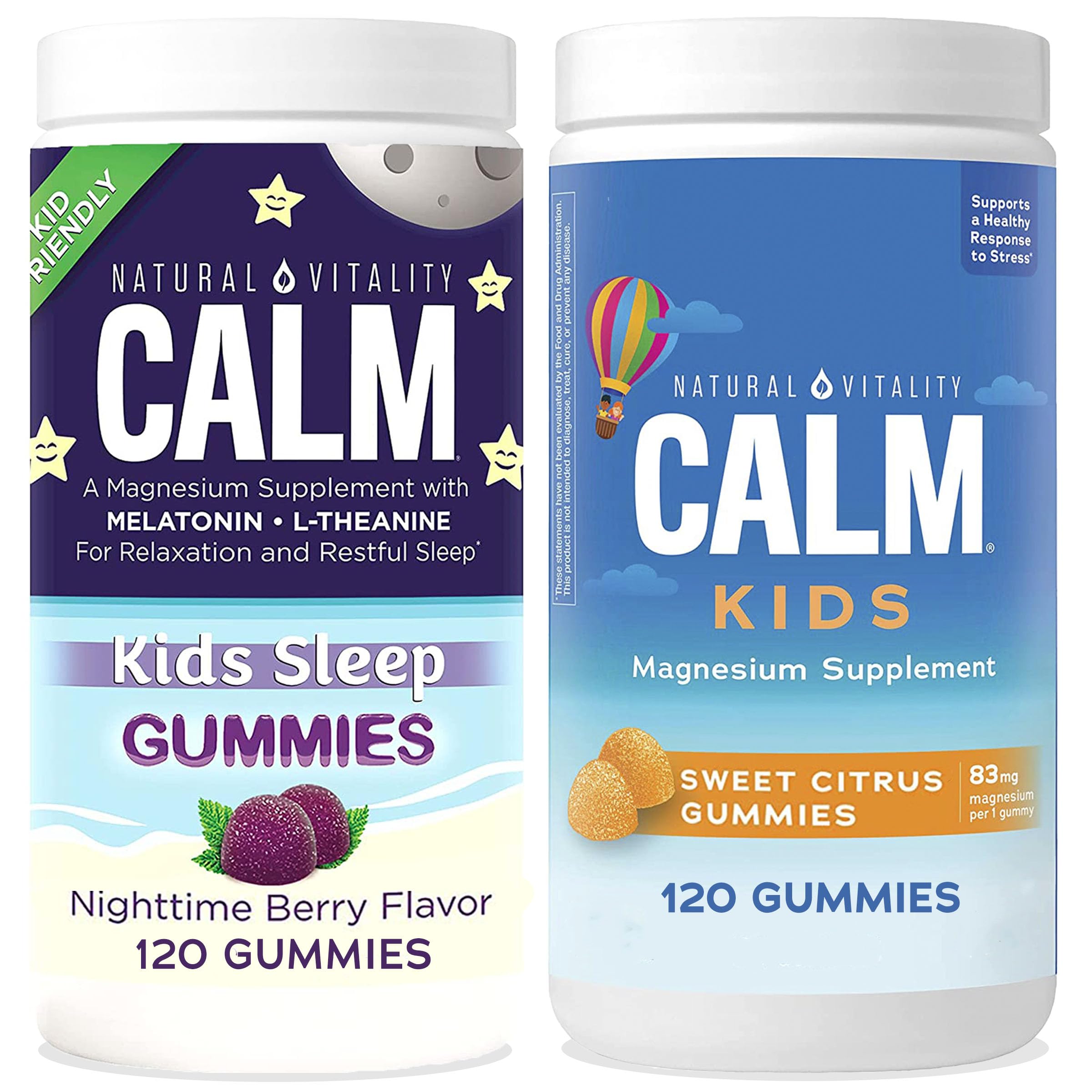 Natural Vitality Calm Magnesium Citrate Kids Supplement Stress Relief Gummies Supports a Healthy Response to Stress Gluten Free Vegan - Sweet Citrus (120 Gummies) & Nighttime Berry (120 Gummies)