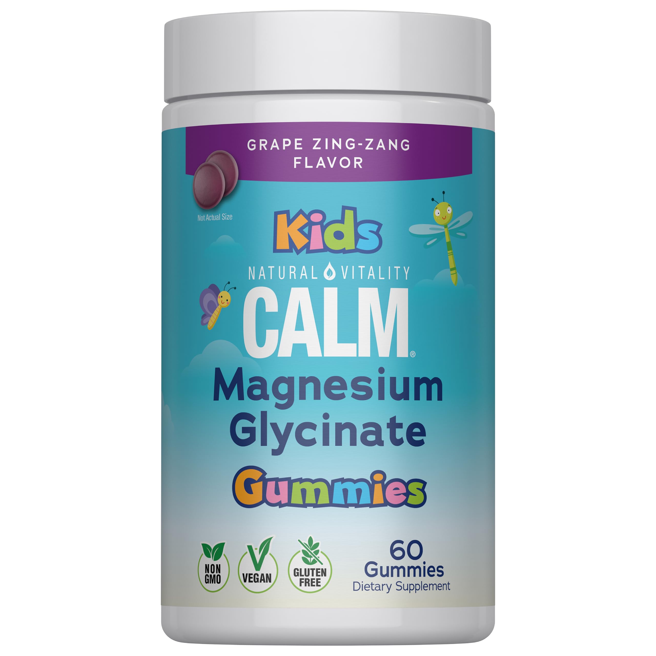 Highly Absorbable Magnesium Glycinate Bursting with a tangy grape flavor that kids love, Natural Vitality CALM Kids Magnesium Glycinate Gummies are a delicious way to support growing minds and bodies with Magnesium. Delicious Grape Flavor Each serving delivers highly absorbable Magnesium Glycinate in a fun, flavorful, and convenient way, with a delicious grape flavor. Vegan and free of gluten, synthetic color, and artificial sweetener, these gummies help kids enjoy CALM anytime, anywhere. Natural Vitality CALM, the 1 Magnesium Gummy Brand Since 1982, Natural Vitality CALM has been a trusted leader in magnesium supplementation, helping millions embrace the benefits of this essential mineral. Delicious CALM gummies are 1 among consumers and a convenient way to experience the power of magnesium anytime, anywhere. Disclaimers: These statements have not been evaluated by the Food and Drug Administration. This product is not intended to diagnose, treat, cure, or prevent any disease. Total US Natural Channel SPINS L12W, L24W, L52W Data Ending 04 20 25. Compared to Magnesium Oxide.CALM ANYTIME, ANYWHERE: Enjoy CALM anytime, anywhere. No water, mixing, or blending required!. NO UNNECESSARY ADDITIVES: Free from gluten, artificial sweetener synthetic color, and made with ingredients that parents trust. HIGH-QUALITY INGREDIENTS: Crafted with premium magnesium glycinate and not blended with other magnesium forms. DELICIOUS GRAPE FLAVOR: These gummies are vegan friendly and have a tangy, sour grape flavor kids love. KID-FRIENDLY MAGNESIUM SUPPORT: Formulated with magnesium glycinate to help support growing minds and bodies. .