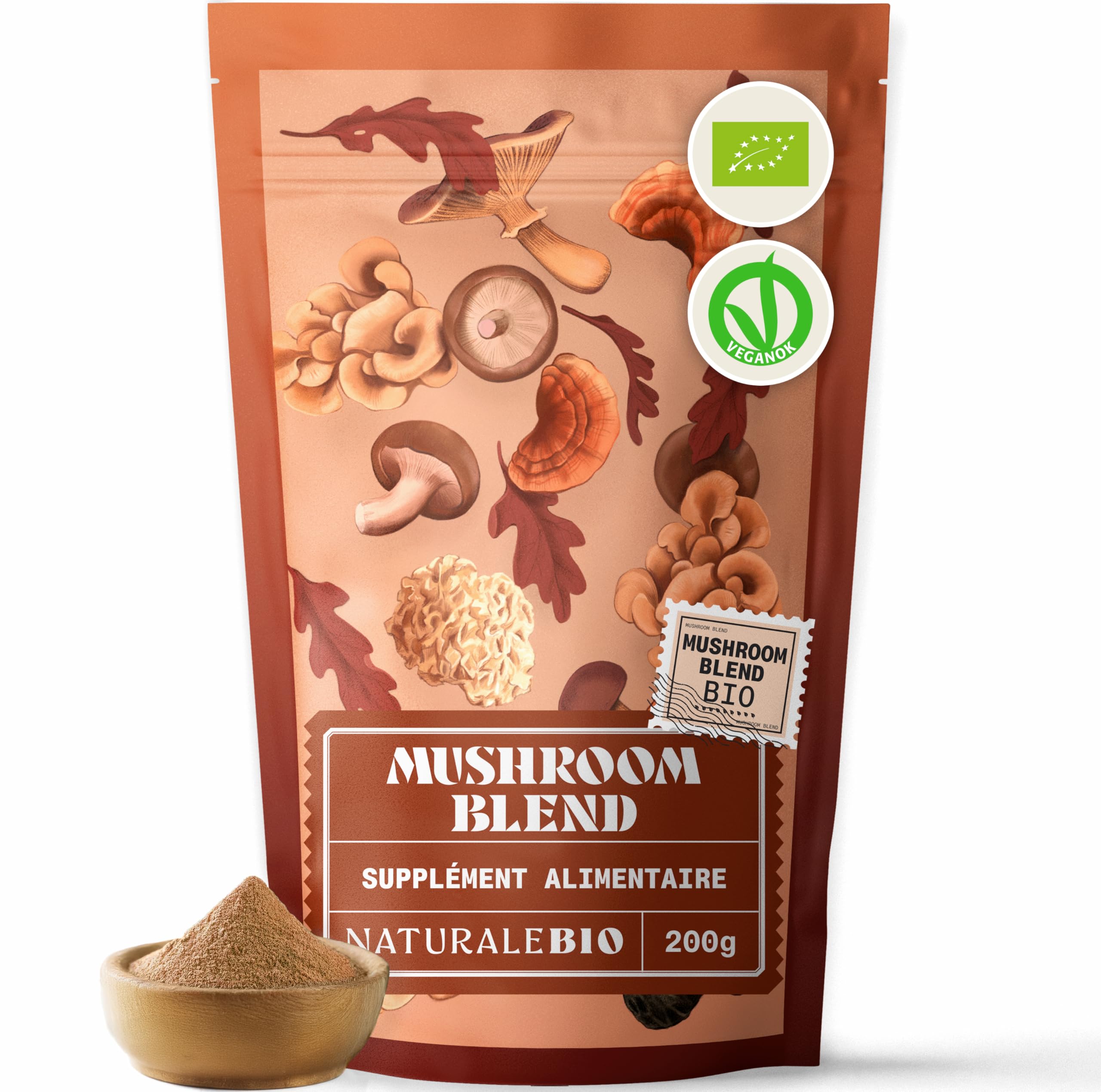 Eco-friendly, ethical, and sustainable: Responsibly crafted with sustainable ingredients. It's a perfect choice for health-conscious individuals seeking clean, plant-based superfoods. 100 natural: Our mushrooms are cultivated in China, where they have been essential ingredients for natural wellness for centuries. They are vegan, gluten-free, and non-GMO, ensuring optimal quality. Easy to consume: Add them to your coffee, tea, or smoothie to boost immunity, energy, and focus throughout the day. Mix them into smoothies, protein shakes, soups, stews, and oatmeal for a delicious twist. Health-boosting: Delivers multiple benefits in one product: strengthens the immune system, improves cognitive function and energy, reduces stress and promotes relaxation, and supports gut and cardiovascular health. Formulated with seven organic mushrooms, each offering unique and complementary benefits: Reishi (14.3 ), Lion's Mane (14.3 ), Chaga (14.3 ), Maitake (14.3 ), Cordyceps Sinensis (14.3 ), Shiitake (14.3 ), and Tremella (14.2 ). Our mushrooms are sourced from Chinese farms where they have been used for centuries in traditional medicine. Our powder is vegan, gluten-free, and non-GMO, guaranteeing the highest quality and excellent value.Écoresponsable, éthique et durable: Conçu de façon responsable avec des ingrédients durables. C'est un choix parfait pour des personnes soucieuses de leur santé à la recherche de superaliments propres et végétaux. 100 naturel: Nos champignons sont cultivés en Chine, où ce sont des ingrédients essentiels pour le bien-être naturel depuis de nombreux siècles. Ils sont vegan, sans gluten et non-OGM, garantissant une qualité optimale. Facile à consommer: Ajoutez-en à votre café, thé ou smoothie pour renforcer l'immunité, l'énergie et la concentration pour toute la journée. Mélangez-en à vos smoothies, boissons protéinées, soupes, ragoûts et gruaux pour une touche savoureuse. Bénéfique pour la santé: Apporte de multiples bienfaits en un seul produit : renforce le système immunitaire, améliore la fonction cognitive et l'énergie, réduit le stress et favorise la relaxation, soutient la santé intestinale et cardiovasculaire. Formulée avec sept champignons biologiques, chacun apportant des bienfaits uniques et complémentaires: Reishi (14.3 ), Crinière de Lion (14.3 ), Chaga (14.3 ), Maitake (14.3 ), Cordyceps Sinensis (14,3 ), Shiitake (14.3 ) et Tremella (14.2 ). Nos champignons proviennent de fermes chinoises où ils sont utilisés depuis des siècles dans la médecine traditionnelle. Notre poudre est végane, sans gluten et sans OGM, garantissant la plus haute qualité et un excellent rapport qualité-prix.NaturaleBio Mélange de Champignons en Poudre 200g. Renforce l'énergie, la fonction cognitive, la santé intestinale et le système immunitaire. Bio, vegan, sans gluten et non-OGM. Facile à consommer. Mélange de champignons 200 g (Lot de 1)