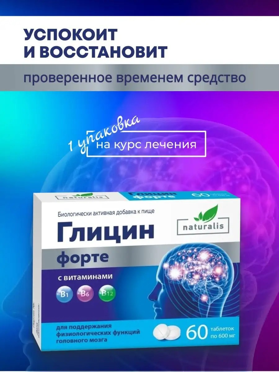 Глицин форте с витаминами В1, В6, В12 нормализует сон, повышает умственную работоспособность, снимает психоэмоциональное напряжение.Взрослым с 18 лет по 1 таблетке 2 раза в день. Таблетки держать вор рту до полного рассасывания. Продолжительность не менее 1 месяца. При необходимости после 10 дневного перерыва можно повторить. Противопоказания: индивидуальная непереносимость компонентов, беременность и кормление грудью. Глицин форте имеет высокую дозировку глицина 300 мг, усилен витаминами В1, В6, В12. Таблетки легко рассасываются, что дает быстрый эффект, не вызывают привыкания при длительном использовании. 1 упаковка на 1 курс лечения.