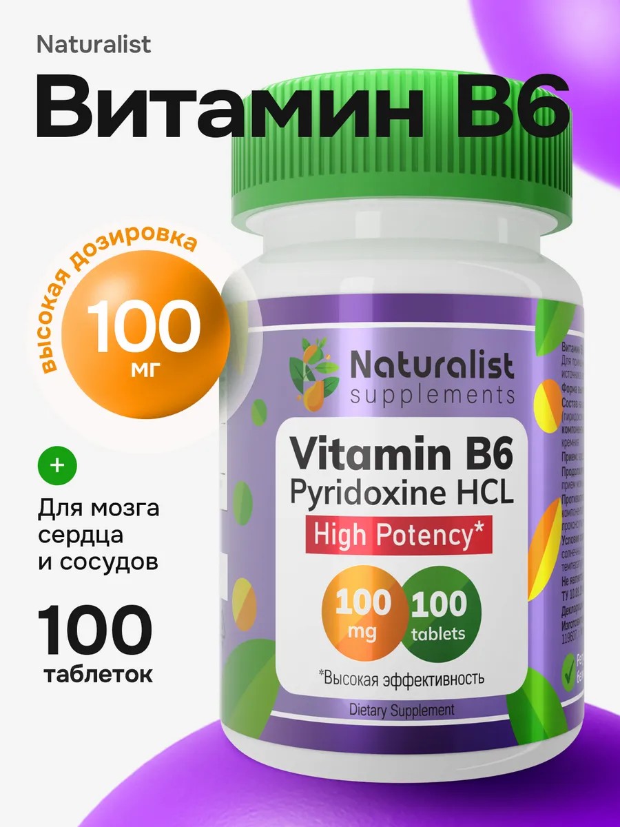 Naturalist предлагает высококачественную пищевую добавку Витамин B6, содержащую 100 мг чистого пиридоксина гидрохлорида в каждой таблетке. Это водорастворимый элемент группы B, жизненно необходимый для каждого организма. Он поддерживает постоянный обмен белков, углеводов и жиров и способствует стабильной работе сердечно-сосудистой, венозной и нервной систем.