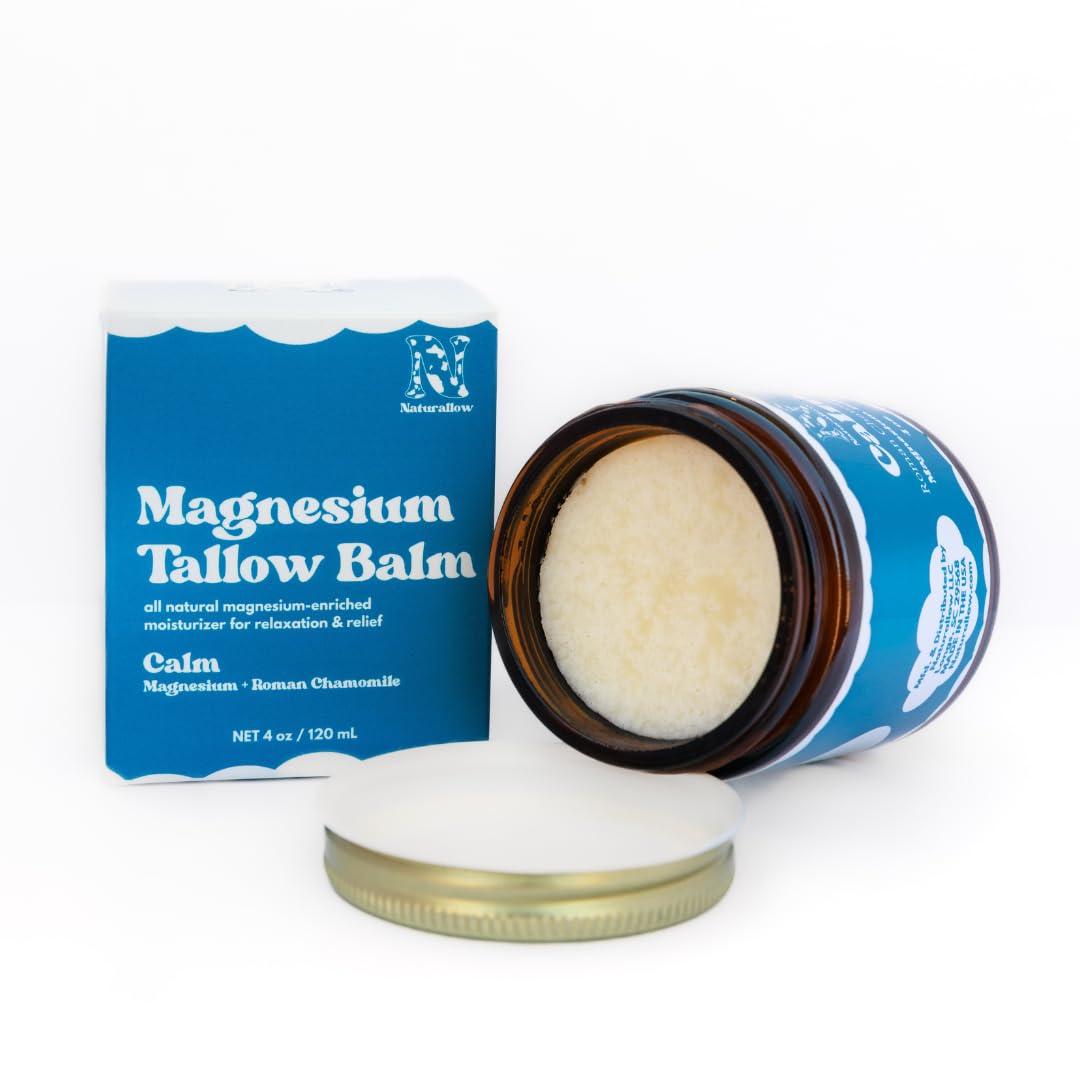Experience the soothing power of Naturallow's Magnesium Tallow Balm, a luxurious, all-natural alternative to traditional magnesium oils and sprays. Crafted with premium ingredients like grass-fed beef tallow, magnesium chloride, nourishing jojoba oil, and roman chamomile, this balm deeply hydrates while delivering magnesium-rich relief to ease muscle soreness and promote relaxation. Unlike sprays, our non-greasy formula absorbs effortlessly, providing long-lasting comfort and moisture. Infused with calming Roman Chamomile, it creates a serene experience that supports better sleep and enhances overall well-being.Premium Topical Magnesium Delivery: Formulated with magnesium chloride to absorb through the skin, helping ease sore muscles, release tension, and support relaxation—without pills or powders. Crafted for Real Skin Real Life: Designed for sore muscles, tight shoulders, growing pains, bedtime routines, and everyday stress—one simple balm, countless uses. Clean, Family-Friendly Ingredients: Made with organic, thoughtfully sourced ingredients and free from synthetic fragrances, parabens, and harsh additives. Gentle enough for daily use. Deeply Nourishing, Non-Greasy Formula: Grass-fed beef tallow, jojoba oil, and beeswax deeply moisturize and protect the skin barrier while absorbing effortlessly—no sticky or oily residue. Supports Rest, Recovery Relaxation: Ideal for nighttime use or post-workout recovery. Magnesium and Roman chamomile work together to calm the body and help support more restful sleep.