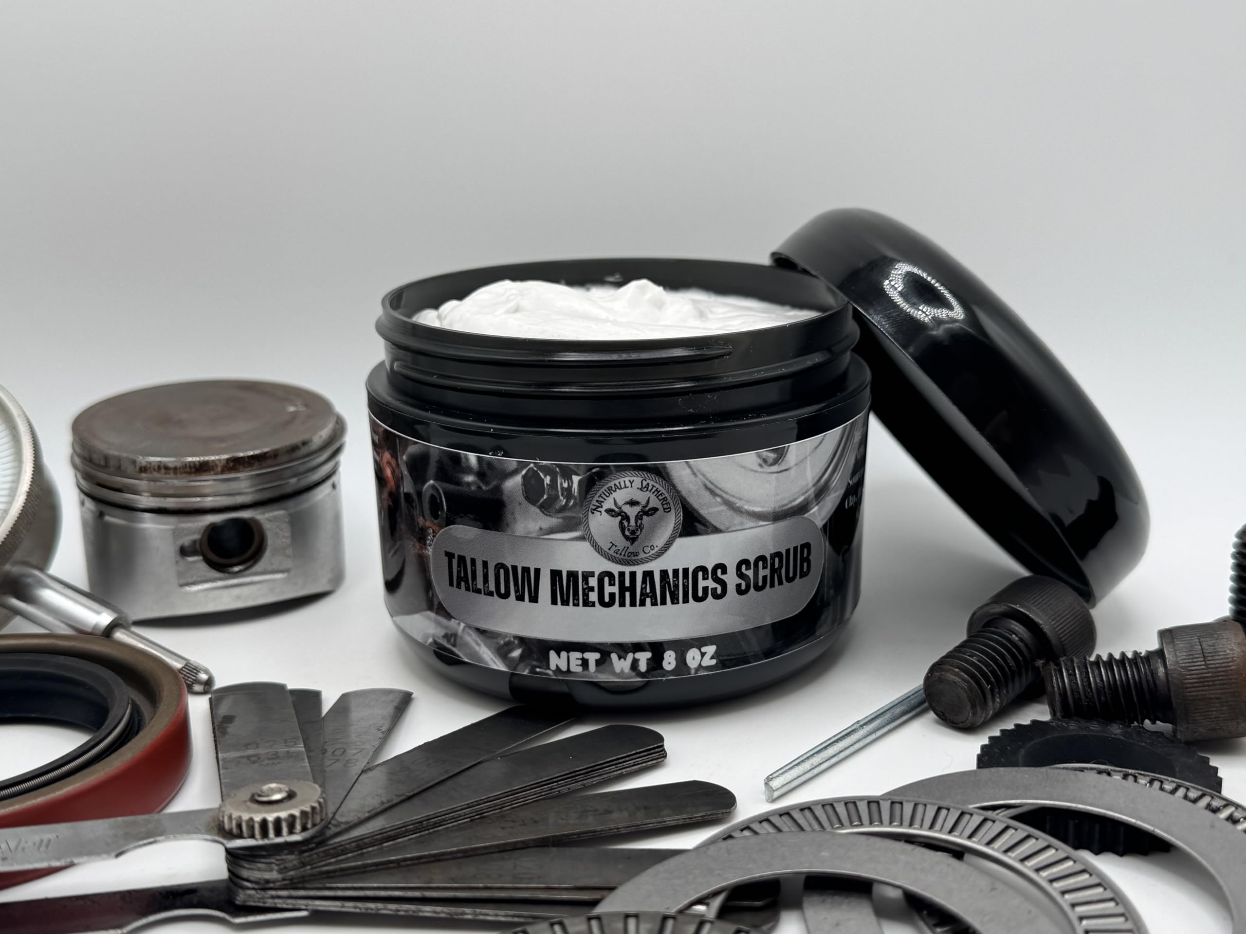 Introducing the Naturally Lathered Tallow Co. Mechanics Scrub, an 8 oz powerhouse hand cleaner designed specifically for those who work hard with their hands. This heavy-duty scrub combines the natural benefits of tallow with effective cleansing agents to tackle the toughest workshop grime, grease, and dirt. The formula features premium ingredients including organic glycerin and pumice powder for deep cleaning, while vitamin E oil helps maintain skin health. Enhanced with locally sourced tallow and enriched with natural moisturizers, this scrub works to clean thoroughly without leaving hands feeling stripped or dry. The convenient 8 oz jar is perfect for keeping at your workbench or in the garage, and the thick, creamy texture provides excellent coverage and scrubbing power. Whether you're a professional mechanic, DIY enthusiast, or anyone who needs serious cleaning power, this scrub is formulated to remove stubborn substances while being gentle enough for regular use. For external use only, this workshop-tested formula comes in a durable black jar that's built to withstand the demanding environment of any garage or workshop.