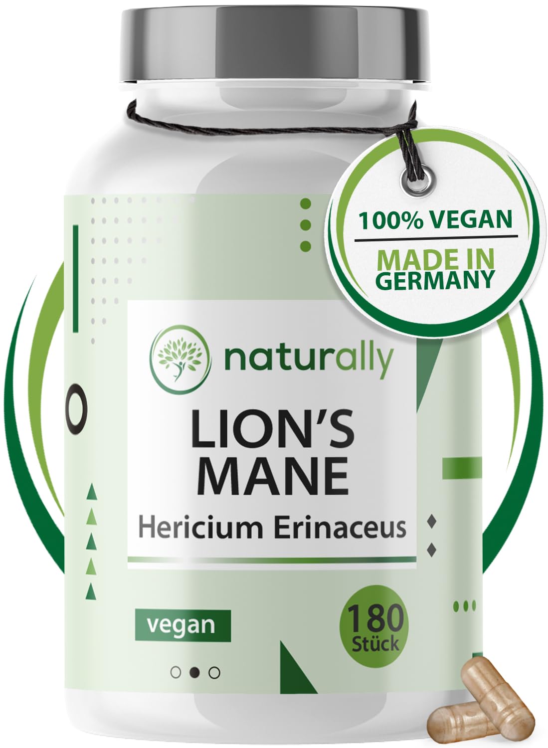 ✓ is very important to us.If you are not satisfied with one of our products or have any questions, please contact us.Customers who bought this product also searched for: Ashwagandha capsules, chaga capsules, reishi, lions mane mushroom, monk pepper, probiotics.✓ Ü: Our Lions Mane capsules are manufactured in certified systems in Germany and meet all safety and quality standards.✓ Our products are of course genetic engineering, lactose -free and sugar -free.✓ : The lion mane mushroom is a vital fungus with many minerals and trace elements, including zinc, iron, selenium and magnesium.In addition, the Hericium Erinacus contains almost all essential amino acids.We recommend taking up to 3 capsules with lots of water every day.The content of the Lion's Mane capsules is enough for 2 months.✓ -ä: A can contains 180 lions mane capsules.Each of them contains 650mg of a lion maneus Mushroom Extract.The Hericium erinacus extract used has a ratio of 30: 1 with 30 polysaccharides.It is 1,950 mg Lions Mane per daily dose, which corresponds to 58,500 mg of the vital mushroom.✓ liegt uns sehr am Herzen. Sollten Sie einmal mit einem unserer Produkte nicht zufrieden sein oder Fragen dazu haben, melden Sie sich gerne bei uns. Kunden, die dieses Produkt kauften suchten auch nach: ashwagandha kapseln, chaga kapseln, reishi, lions mane mushroom, mönchspfeffer, probiotika. ✓ Ü: Unsere Lions Mane Kapseln werden in zertifizierten Anlagen in Deutschland hergestellt und erfüllen sämtliche Sicherheits- Qualitätsstandards. ✓ wie Magnesiumstearat, Trennmittel, Aromen, Farbstoffe, Konservierungsstoffe oder ähnliches. Unsere Produkte sind selbstverständlich gentechnikfrei, laktosefrei und zuckerfrei. ✓ : Der Löwenmähne Pilz ist ein Vitalpilz mit vielen Mineralstoffen und Spurenelementen, unter anderem Zink, Eisen, Selen und Magnesium. Zusätzlich enthält der Hericium Erinaceus fast alle essentiellen Aminosäuren. Wir empfehlen täglich bis zu 3 Kapseln mit viel Wasser einzunehmen. Der Inhalt der Lion's Mane Kapseln reicht für 2 Monate. ✓ -Ä: Eine Dose enthält 180 Lions Mane Kapseln. Jede davon enthält 650mg eines Löwenmähne Pilz Extrakt hochdosiert. Der verwendete Hericium Erinaceus Extrakt hat ein Verhältnis von 30:1 mit 30 Polysacchariden. Pro Tagesdosis sind es 1.950 mg Lions Mane Extrakt, was 58.500 mg des Vitalpilzes entspricht.naturally Lions Mane Kapseln [180 Stück] 1950mg 30:1 Extrakt pro Tagesdosis entspricht 58.500mg Hericium Erinaceus - Löwenmähne Kapseln - Made in Germany, vegan, pilz, mushroom