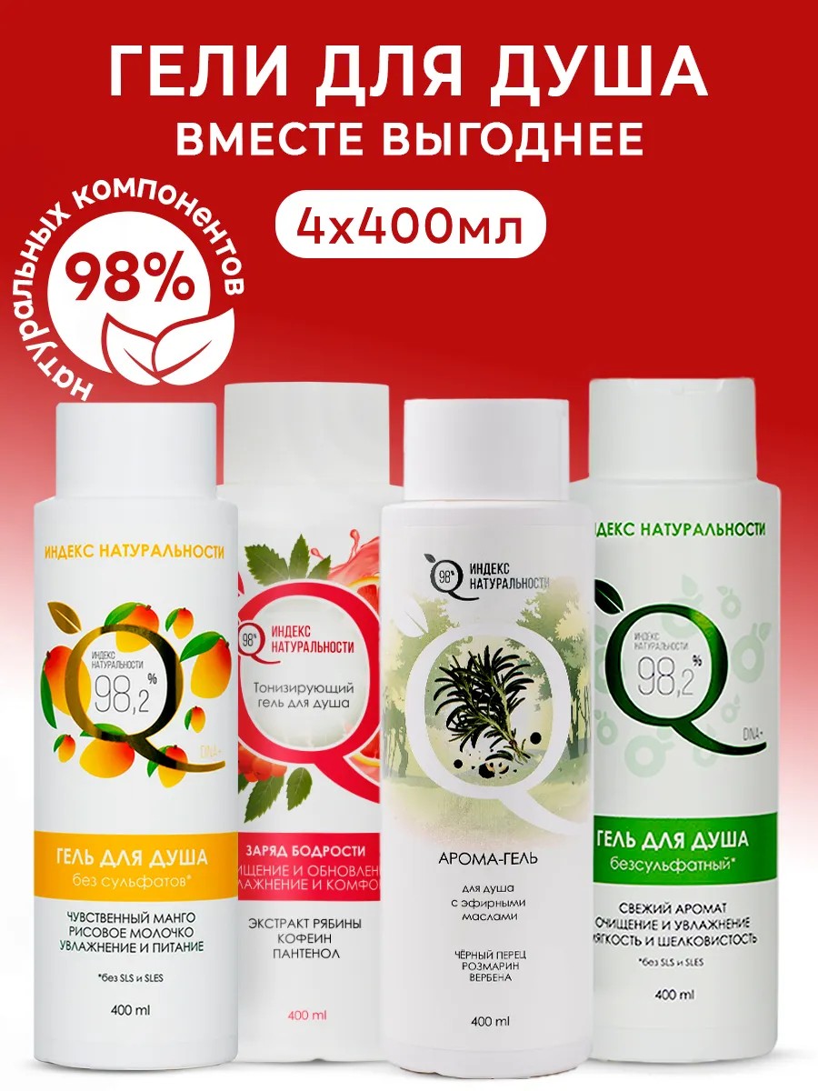 | Комплектация | Гель для душа манго 400 мл, ИНДЕКС НАТУРАЛЬНОСТИ - 1 шт; гель для душа рябина 400 мл, ИНДЕКС НАТУРАЛЬНОСТИ - 1 шт; гель для душа яблоко 400 мл, ИНДЕКС НАТУРАЛЬНОСТИ - 1 шт; Арома-гель для душа 400 мл, ИНДЕКС НАТУРАЛЬНОСТИ - 1 шт |