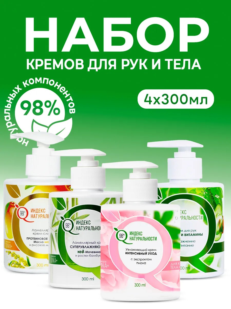 | Комплектация | Увлажняющий крем для рук 300мл - 1 шт; Ламеллярный крем сливки манго 300мл - 1 шт; крем для лица и тела с мочевиной 300мл - 1 шт; крем для лица и тела пион 300мл - 1шт |