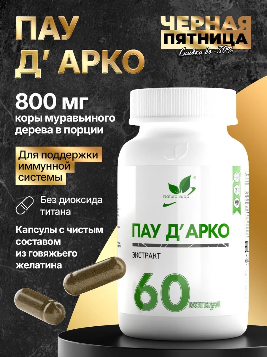 Pau De Arco (Pau De Arco, Pau D'Arco) is an extract of the bark of the ant tree. It contains lapachol (a natural organic compound with bactericidal properties), a complex of minerals (zinc, iron, selenium, magnesium), amino acids, alkaloids, bioflavonoids, and tannins.