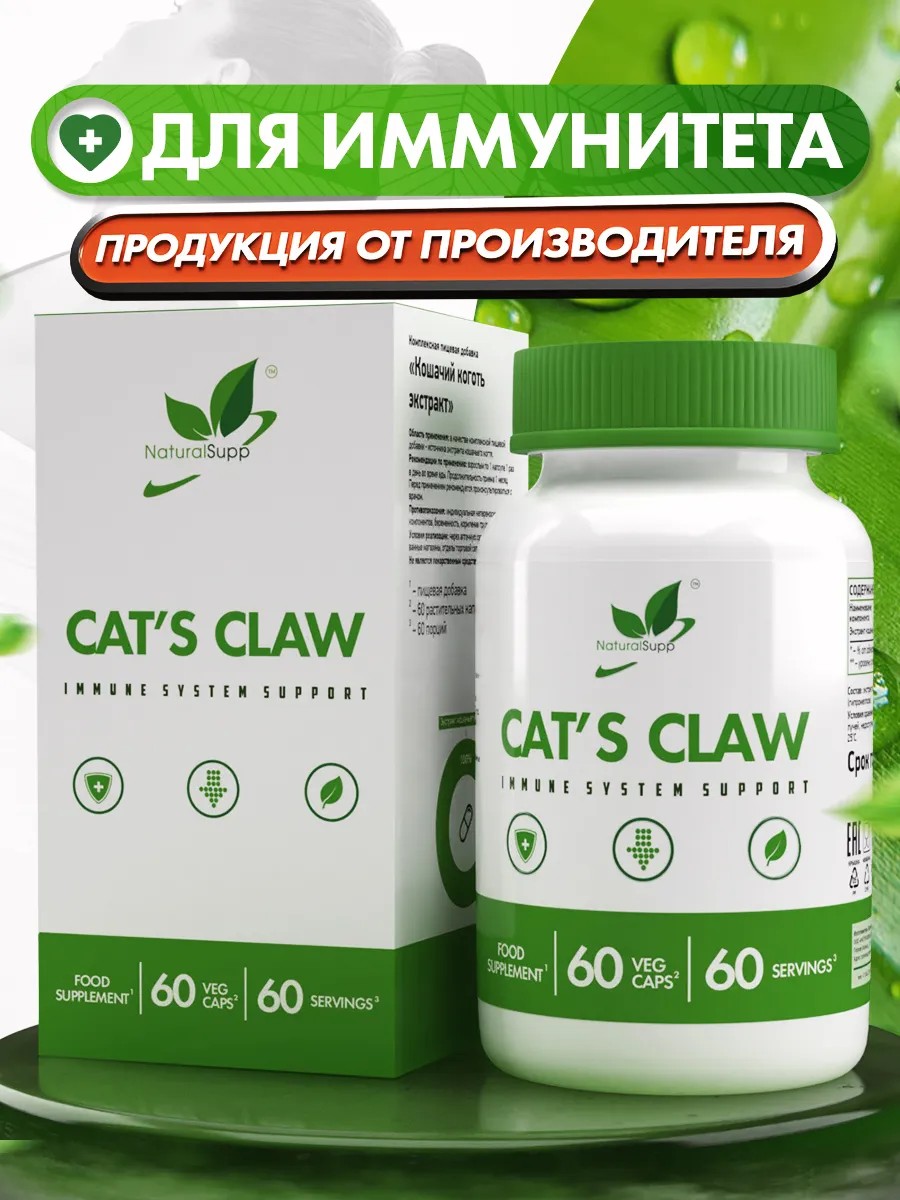 В состав комплексной пищевой добавки для поддержания иммунитета входит экстракт кошачьего когтя. Это специально выделенные активные компоненты из коры лианы ункарии, которые содержат алкалоиды, ринхофиллин, полифенолы и растительные стероиды. Составляющие обладают противовоспалительными и противовирусными свойствами, способствуют предотвращению образования тромбов, ускорению работы Т-лимфоцитов, обеспечивающих удаление чужеродных клеток в организме.