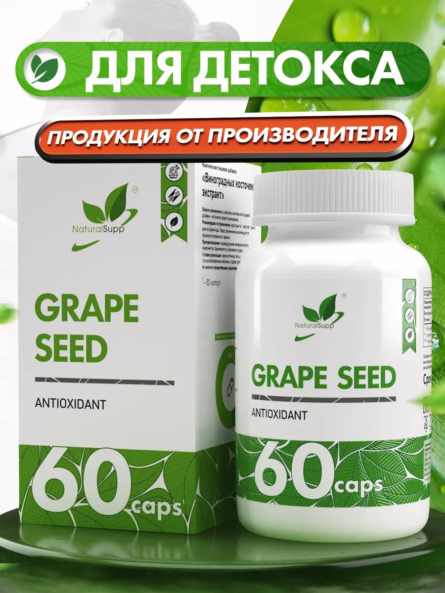 Grape seed extract is a valuable source of polyphenols, proanthocyanidins, catechins, quercetin, and vitamins C and P. It is used for the prevention and treatment of cardiovascular diseases (including myocardial infarction), helps normalize blood pressure, improve capillary microcirculation, strengthen vascular walls, prevent the development of varicose veins and rosacea, and protect the body from oxidative stress. The supplement helps improve cerebral blood flow, protect against retinopathy, improve retinal function and sensitivity in myopia, and relieve eye strain caused by computer work. Grape seed proanthocyanidins have estrogen-like properties and help reduce the risk of breast and uterine tumors, as well as the frequency and severity of menopausal symptoms. The supplement has anti-inflammatory and antihistamine properties. Directions for use: Adults: 1 capsule daily. Duration of use: at least 1 month. Repeat if necessary. Contraindications: Individual intolerance to any of the ingredients, pregnancy, and breastfeeding. Consult a healthcare professional before use. Store in a dry place, out of reach of children, and out of direct sunlight. Natural color variation may occur.