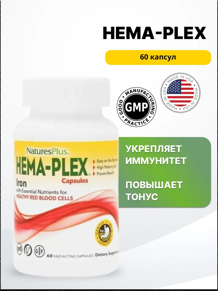 Hema-Plex - это не только витамин железо, это целый комплекс витаминов и минералов. Хелат железа легче переносится желудком, чем обычные железосодержащие добавки. Недостаточность железа ведет к снижению работоспособности, утомляемости, слабости, головокружениям, выпадению волос. Также в формулу комплекса Хема Плекс входят такие важные для здоровья крови элементы, как витамины С и Е, витамины группы В, а также медь и фолиевая кислота. Железо и витамин В12 входят в состав гемоглобина, который обеспечивает транспорт кислорода. Состав: железо, цинк, медь, витамин c, витамин b6, кальций, рибофлавин, ниацин, селен, витамин b12, марганец, пантотеновая кислота, l-цистеин, свекла, фолат, Витамин E, Тиамин (витамин B1), биофлавоноиды фитоплаценты, Bioperine.