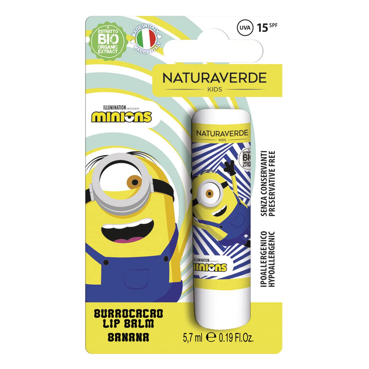 Naturaverde Kids – Minions Banana Burrocacao. Made with beeswax, organic shea butter, and vitamin E, it safely protects, moisturizes, and nourishes lips. With UVA-UVB sunscreens (SPF 15), it's ideal for all seasons. Hypoallergenic – Preservative-free, dermatologically tested, and tested for nickel, chromium, and cobalt. SAFETY WARNING Patient patch test before use. Store in a cool, dry place. Use within a short time after opening.NATURAVERDE Kids: Naturaverde Kids brings play and fun to any time of day and transforms children's daily hygiene routine into magical moments of growth. Every moment of daily life, even bath time and hygiene routines, becomes rich in emotion with Naturaverde Kids. Take care of your child: transform every moment of your children's daily routine into fun with the Naturaverde Kids line dedicated to the Minions, the fantastic yellow creatures that captivate children and adults alike. Features: dermatologically tested, tested for nickel, chromium, and cobalt. Protect your child: with UVA-UVB sunscreens (SPF 15), it is ideal for all seasons. Hypoallergenic and preservative-free. Banana Burrocacao: Naturaverde Kids cocoa butter for children, made with beeswax, organic shea butter, and vitamin E, safely protects, moisturizes, and nourishes lips.Naturaverde Kids - Minions - Beurre de cacao Banane, Beurre de cacao Enfants avec Beurre de Karité BIO, avec Filtres UVA-UVB - SPF 15, Lipstick 5,7 mlDESCRIPTION DU PRODUIT DESCRIPTION DU PRODUIT Naturaverde Kids – Minons Burrocacao à la banane. À base de cire d'abeille, beurre de karité biologique, vitamine E, protège, hydrate et nourrit les lèvres en toute sécurité. Avec filtres solaires UVA-UVB (SPF 15), il est idéal pour toutes les saisons. Hypoallergénique – Sans conservateur testé dermatologiquement, testé au nickel, chrome, cobalt. AVERTISSEMENT DE SÉCURITÉ Patch tester avant utilisation. Conserver dans un endroit frais et sec. Utiliser dans un court délai après ouverture.NATURAVERDE Kids : Naturaverde Kids apporte jeu et divertissement à tout moment de la journée et transforme la routine quotidienne d'hygiène des enfants en moments magiques de croissance : chaque moment de la vie quotidienne, même ceux du bain et de l'hygiène, avec Naturaverde Kids deviennent riches en émotions. Prenez soin de votre enfant : transformez chaque moment de la routine quotidienne de vos enfants en divertissement avec la ligne Naturaverde Kids dédiée aux Minions, les fantastiques créatures jaunes qui passionnent les petits et les grands. Caractéristiques : testé sous contrôle dermatologique, testé au nickel, chrome, cobalt. Protégez votre enfant : avec des filtres solaires UVA-UVB (SPF 15), il est idéal pour toutes les saisons. Hypoallergénique et sans conservateur. Burrocacao à la banane : le beurre de cacao pour enfants Naturaverde Kids à base de cire d'abeille, beurre de karité biologique, vitamine E, protège, hydrate et nourrit les lèvres en toute sécurité.