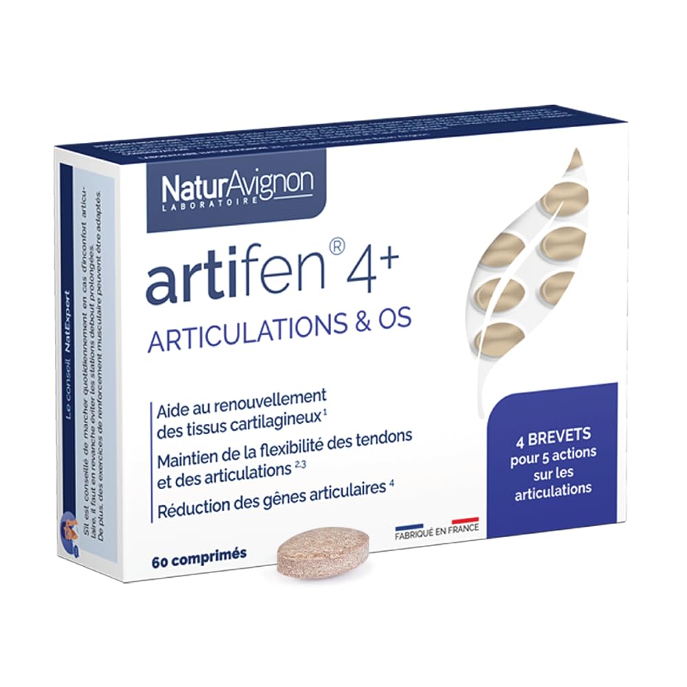 SUITABLE FOR SENSITIVE STOMACHS - 3 tablets to be taken throughout the day with meals. The oblong tablets are easy to swallow and are formulated with a coating ideal for sensitive stomachs. WITH CHONDROITIN, GLUCOSAMINE, AND VITAMINS C AND D - the Articomplex joint complex is a unique and patented combination of vitamin D3, chondroitin, and glucosamine, formulated to prevent cartilage degradation. PROVEN EFFECTIVENESS 4 PATENTS - Laboratoire NaturAvignon has demonstrated that the patented combination of vitamin D and devil's claw in ARTIFEN 4 reduces the process responsible for joint discomfort by 75 . In vitro study Naturalpha 2011. THE BEST HARPAGOPHYTUM EXTRACT - HARPAGONOV, the harpagophytum extract, guarantees an average of 15 harpagosides (the effective molecules), up to 5 times more than most traditional extracts for relieving joint discomfort. 5 ACTIONS FOR YOUR JOINTS - Thanks to the innovative extra-strength harpagophytum and boswellia, ARTIFEN 4 relieves joint discomfort, promotes joint flexibility, facilitates cartilage renewal, and supports bone health.