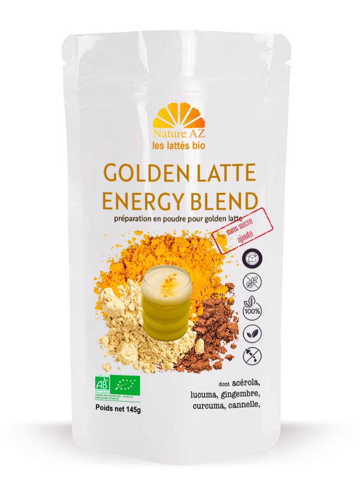 Discover the Golden Latte Energy Blend by Nature AZ – Organic Lattes, an innovative powdered latte mix made from a unique blend of organic turmeric, ginger, cinnamon, acerola, lucuma, apple, and banana. Unlike simple spice blends, our formula uses dried and cold-ground fruits, a gentle method that guarantees optimal nutritional and flavor quality. No added sugar, low glycemic index. This golden latte is a caffeine-free alternative, rich in natural antioxidants and vitamin C, ideal for a boost during the day without a sudden energy spike. Its natural sweetness will win you over, without the need for any sugar or sweeteners. Enjoy it any time of day, in hot or cold plant-based milk (oat, almond, coconut, etc.). It can also be used in smoothies, porridge, or other healthy recipes. SAFETY WARNING Contains ingredients that may cause allergic reactions in some people. Consume with caution.Nature AZ Golden Latte Bio Energy Blend, Curcuma, Gingembre, Acerola, Lucuma, Sans Sucre Ajouté, IG bas, Sans Maltodextrine, Vegan 100 Naturel, Sachet 145g env. 30 doses, Fabrication FrançaiseDESCRIPTION DU PRODUIT DESCRIPTION DU PRODUIT Découvrez le Golden Latte Energy Blend par Nature AZ – Les Lattés Bio, une préparation en poudre innovante pour latte, issue d'un mélange unique de curcuma bio, gingembre, cannelle, acerola, lucuma, pomme et banane. Contrairement aux simples assemblages d'épices, notre formule utilise des fruits séchés puis broyés à froid, une méthode douce qui garantit une qualité nutritionnelle et gustative optimale. Sans sucre ajouté, Indice glycélique bas. Ce latte doré est une alternative sans caféine, riche en antioxydants naturels et en vitamine C, idéale pour un coup de boost dans la journée, sans pic d'énergie brutal. Sa douceur naturelle vous séduira, sans qu'aucun sucre ou édulcorant ne soit nécessaire. À consommer à tout moment de la journée, dans du lait végétal chaud ou froid (avoine, amande, coco…). Peut aussi s'utiliser en smoothie, porridge, ou dans des recettes healthy. AVERTISSEMENT DE SÉCURITÉ Contient des ingrédients qui peuvent causer des réactions allergiques chez certaines personnes. Consommer avec prudence.