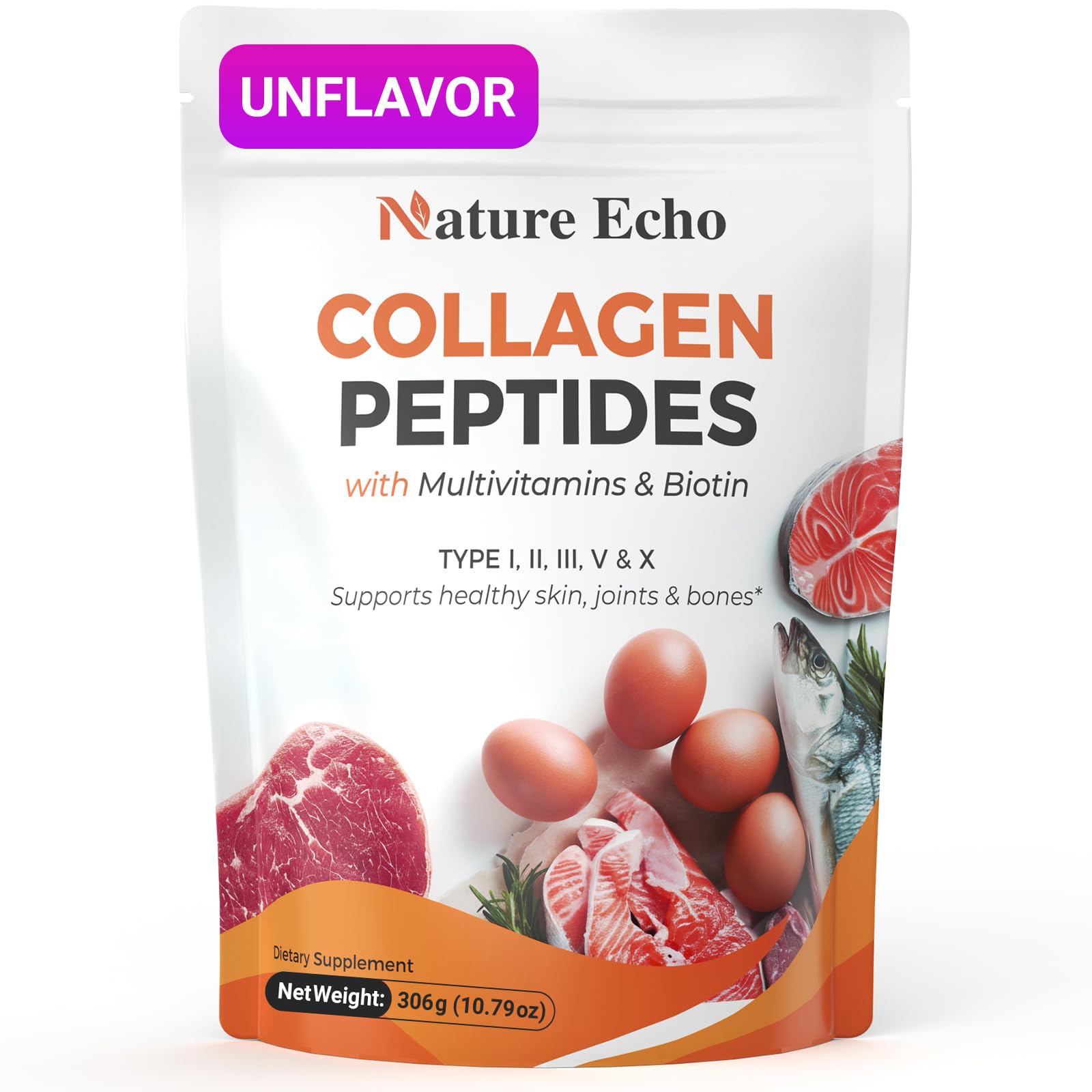 Nature Echo Collagen Peptides Powder Premium Hydrolyzed Multi-Collagen Complex with Biotin Hyaluronic Acid & Essential Vitamins for Skin Hair & Joint Health - Unflavored (30 Servings)