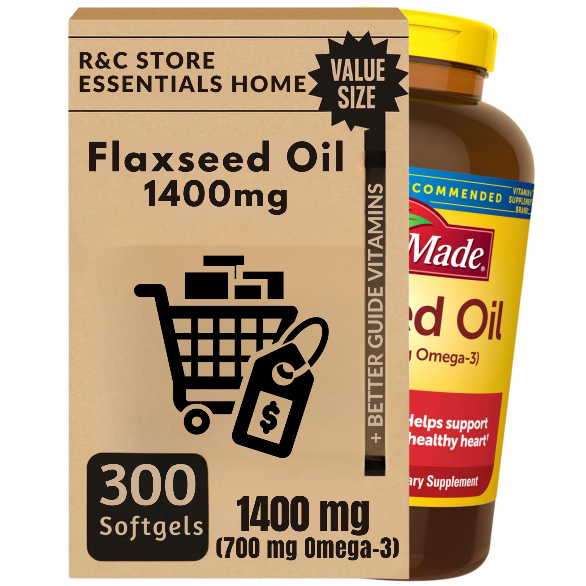 Nature Flaxseed Oil Capsules 1400mg (300 Softgels) | Plant-Based Omega-3 ALA | Bundle with Essential Vitamins Guide by R&C Store
