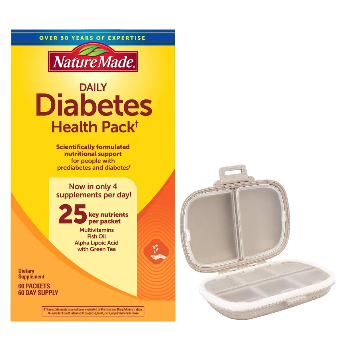 Key Features: This Bundle include One box of Nature Made Diabetes Health Pack, 60 Packets, and a pill oragnizer Each nutritional supplement pack contains a comprehensive combination of key vitamins, minerals and other supplements DIRECTIONS: For adults, take the contents of one pack daily with water and a meal. These statements have not been evaluated by the Food and Drug Administration this product is not intended to diagnose, treat, cure, or prevent any disease Bundle with an exclusive pill oragnizer. It has dimension 4.3 3.5 1.2 inches. 8 Independent Spaces with Triple Seal Design. Keeps the pills from Falling out, and prevent from Moisture and Dust.