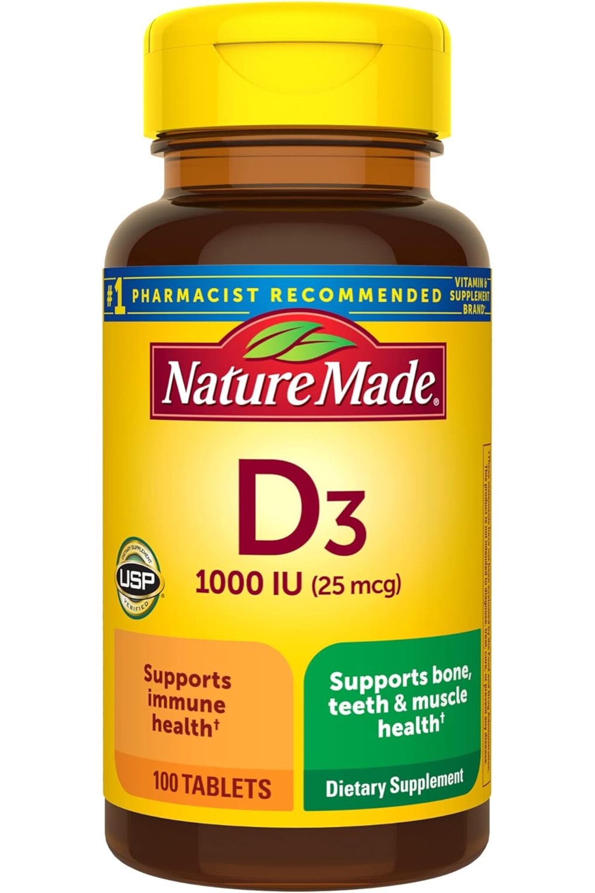 • Supplement that supports immune, muscle, tooth, and bone health: One bottle of 100 Nature Made Vitamin D3 1000 IU (25 mcg) Tablets for a 100-day supply.