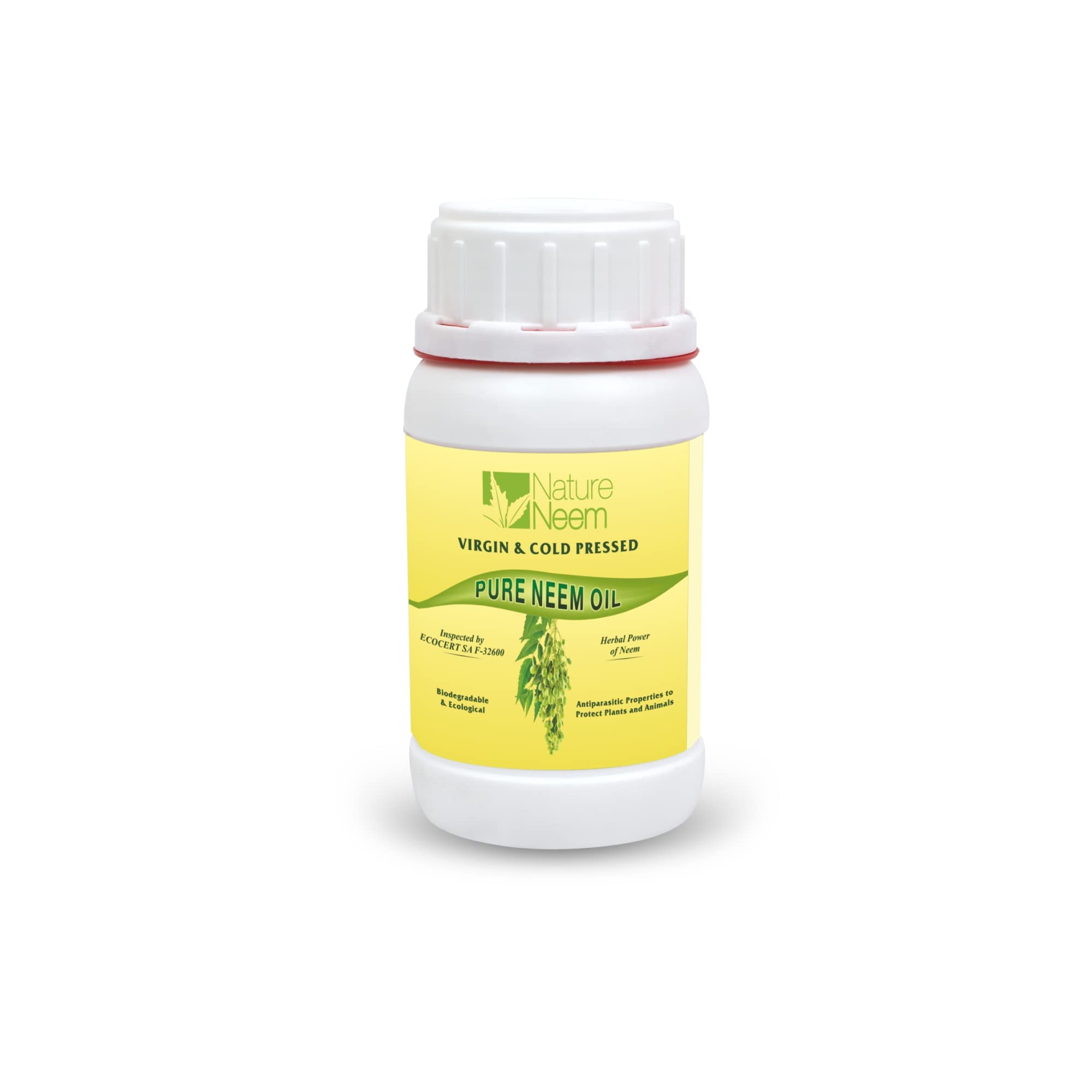 This product comes directly from the manufacturer Nature Neem, a market leader with over 30 years of experience in the neem industry. The quality of neem oil varies depending on the manufacturing method. Good neem oil should contain at least 3000 ppm of azadirachtin and should be certified by at least one organization such as Ecocert. Beware of cheaper products offered by some suppliers that are industrial neem oil containing 150 ppm of azadirachtin without desirable results. Our neem oil is obtained by cold-pressing the kernels of segregated, ripe neem seeds from the current season. It is 100 pure, without stabilizers, emulsifiers, or additives, and contains approximately 3300 ppm azadirachtin. The production process and quality are certified and monitored by Ecocert in accordance with USDA, EU, and JAP organic standards. Our pure neem oil is primarily used in cosmetics, massage, and other applications. Pure neem oil is water-soluble and requires emulsification. Do not self-emulsify or add soapy water. Incorrect dosage can damage the beneficial components of the neem oil. If you are looking for neem oil in spray form, purchase our water-soluble neem oil, optimized for plants (TotalCare) and animals (BioCare). For more information: natureneem.comApplications: cosmetics, skincare, massage, soap. Additional information: natureneem.com. This product is insoluble in water. We have water-soluble neem oil for plants (TotalCare) and for animals (BioCare). These products can be mixed with water for spraying. Contains 4000 ppm of azadirachtin compared to 600 ppm of other manufacturers' lower-cost fruit neem oil. Genuine organic neem oil: raw materials and production processes tested and certified by ECOCERT in accordance with USDA, EU, JAP, and Soil Association standards. Each bottle is tracked with the lot number and expiration date. Direct from the manufacturer: pure, cold-pressed neem oil extracted from ripened neem seeds harvested during the current season.NatureNeem Huile de neem pure et vierge 1ère pressée à froid – 250 ml – Certifié 100 naturelDESCRIPTION DU PRODUIT Produit issu directement du fabricant Nature Neem, l'un des leaders du marché avec plus de 30 ans d'expérience dans l'industrie neemindustrice. La qualité de l'huile de neem varie selon la méthode de fabrication. Une bonne huile de neem doit contenir au moins 3000 ppm d'azadirachtine et doit être certifiée par au moins une organisation comme Ecocert. Attention, les produits moins chers proposés par certains fournisseurs sont l'huile de neem industrielle qui contient 150 ppm d'azadirachtine sans résultats souhaitables. Notre huile de neem est obtenue par pression à froid du noyau de graines de neem mûres ségrégées de la saison actuelle. Elle est 100 pure, sans stabilisants, émulsifiants ou additifs et contient environ 3300 ppm azadirachtine. Le processus de production et la qualité sont certifiés et suivis par Ecocert conformément aux normes biologiques USDA, UE et JAP. Notre huile de neem pure est principalement utilisée dans les cosmétiques, les massages, etc. L'huile de neem pure se dissout dans l'eau et nécessite une émulsification. Ne pas auto-émulsionner et ajouter une solution savonneuse. Un mauvais dosage peut endommager les ingrédients contenus dans le neem. Si vous êtes à la recherche d'huile de neem en pulvérisation, achetez notre huile de neem soluble dans l'eau optimisée pour les plantes (TotalCare) et pour les animaux (BioCare). Pour plus d'informations: natureneem.comApplications : cosmétiques, soins de la peau, massage, savon. Informations supplémentaires : natureneem.com. Ce produit est insoluble dans l'eau. Nous avons de l'huile de neem soluble dans l'eau pour les plantes (TotalCare) et pour les animaux (BioCare). Ces produits peuvent être mélangés avec de l'eau pour la pulvérisation. Contient 4000 ppm d'azadirachtine par rapport à 600 ppm d'huile de neem de fruits à faible coût d'autres fabricants. Véritable huile de neem bio : matières premières et processus de production testés et certifiés par ECOCERT conformément aux normes USDA, UE, JAP et Soil Association. Chaque flacon est suivi avec le numéro de lot et la date d'expiration. Directement du fabricant : huile de neem pure pressée à froid extraite des graines de neem mûries collectées pendant la saison en cours.