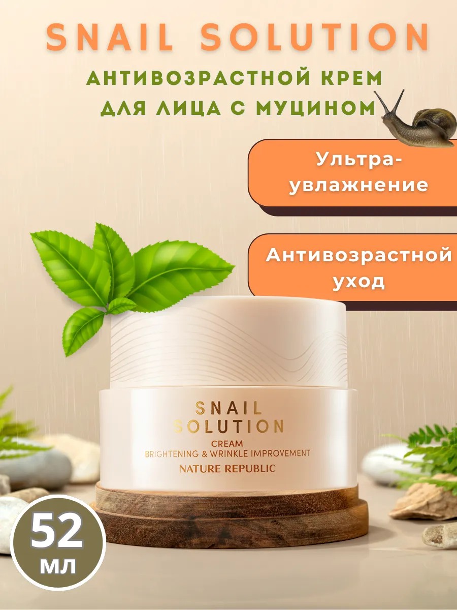 Nature Republic Snail Solution Cream, an anti-aging facial cream with snail mucin, deeply nourishes and hydrates mature, dry, and dehydrated skin, smoothing wrinkles and providing a lifting effect.