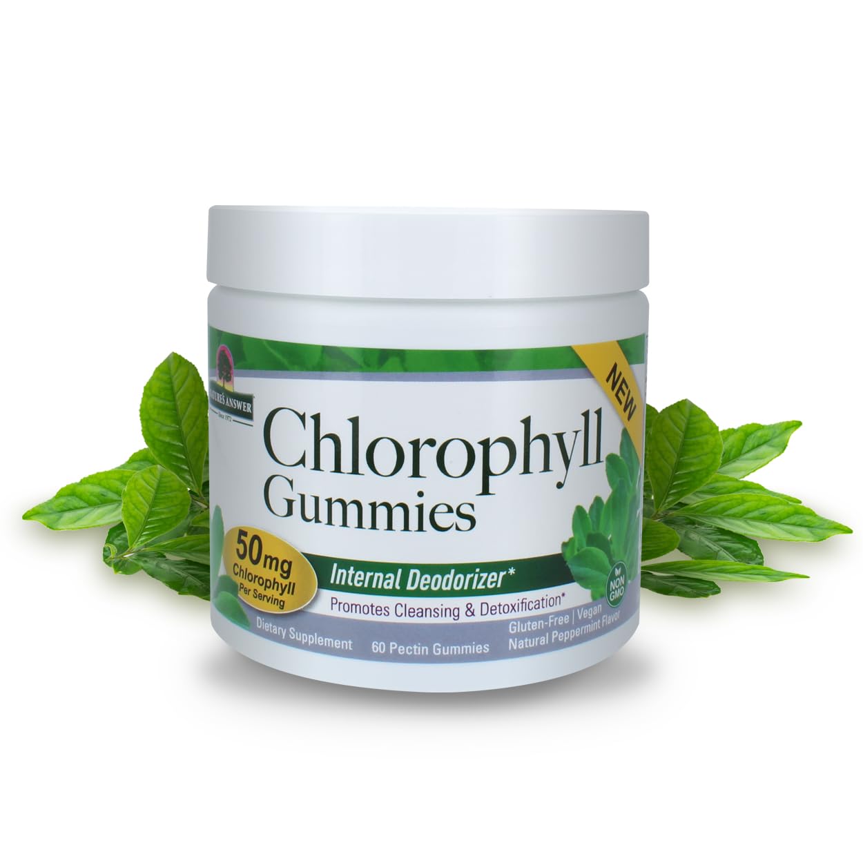 Nature's Answer Difference: Natures Answer is an NSF GMP, ISO Food Safety, and Pharmaceutically Licensed Facility. PERFECT CHOICE: Nature's Answer Chlorophyll Gummies are a convenient way to "get more greens." Our concentrated nutrient dense, pectin based (not gelatin) gummies are a great mess free way to get all the benefits packed into a 2 gummy serving. Chlorophyll helps to support overall energy and is known for its freshening effects for the breath and neutralizing other natural body odors. Chlorophyll nourishes healthy skin and lustrous hair, while supplying micronutrients for overall body wellness. EXCEPTIONAL FEATURES: Chlorophyll is the green substance found in all vegetation that helps plants produce nutrition from sunlight! Chlorophyll is what makes "Green foods" green! Chlorophyll is highly nutritious and provides an array of health supportive natural constituents. PREMIUM QUALITY: Since 1972 Nature's Answer continues to combine the best of traditional herbal remedies, vitamins and minerals with innovative scientific techniques and phytopharmaceutical manufacturing to deliver supplements of the finest quality and value for the entire family. Our Chlorophyll is sourced from dark green Alfalfa leaves, enhanced with Natural Peppermint Oil flavor.