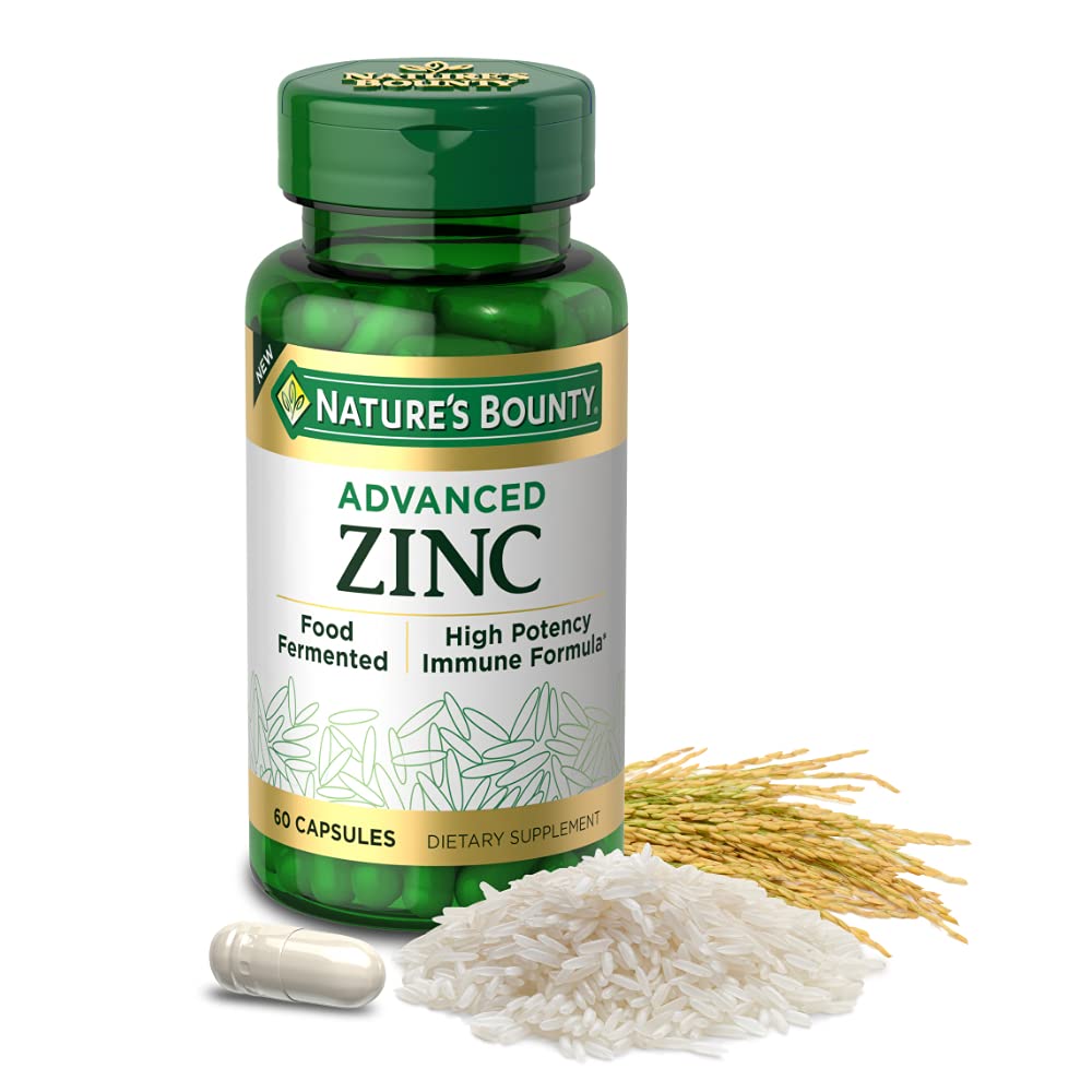 Nature’s Bounty Advanced Zinc is a unique whole food-based bioavailable/absorbable zinc from the #1 Zinc Brand.(1) Support your immune health (1) with this advanced, high-potency formula made with the patented Ultimine™ fermentation process. Fermentation is a natural process that preserves and enriches foods while also helping increase levels and bioavailability of nutrients. For over 2000 years, the koji fermentation method has been used in Japan for making vinegar, miso, and soy sauce. Food fermented koji zinc starts by growing the koji culture on cooked rice. As the koji matures and ferments, it’s enriched with zinc. Then, it’s harvested and processed into powdered koji zinc. This food-based, bioavailable zinc is an important immune-supporting nutrient. (1) Additionally, zinc is an important micronutrient for skin support and can function as an antioxidant within the body.(1) Nature’s Bounty Advanced Zinc supplements are Non-GMO, free of artificial color, flavor, sugar, starch, milk, lactose, soy, gluten, wheat, yeast, sodium, and fish, and are suitable for vegetarians. Individuals who follow a plant-based or vegan diet are at risk of zinc deficiency and often require additional vegetarian-friendly zinc supplementation as they do not consume zinc-rich animal products. At Nature’s Bounty, we only offer trusted products, backed by science, and made with the purest ingredients. Support your immune health with Nature’s Bounty Advanced Zinc. (1) (1) These statements have not been evaluated by the Food and Drug Administration. This product is not intended to diagnose, treat, cure or prevent any disease. (2) Source: IRI Total US-Multi Outlet: Latest 52 weeks ending 7/25/21.FROM THE #1 ZINC BRAND (2): With 50 years of trusted quality, at Nature’s Bounty we only offer trusted products that are backed by science and made with the purest ingredients. SUITABLE FOR VEGETARIANS: Food fermented zinc is ideal for vegetarians who follow a plant-based diet, especially vegans who may be at risk of zinc deficiency because they don’t consume zinc-rich animal products. This supplement is also Non-GMO, and free of artificial color, flavor, sugar, starch, milk, lactose, soy, gluten, wheat, yeast, sodium, and fish. SKIN SUPPORTING SUPPLEMENT (1): Zinc is an important micronutrient for skin support and can function as an antioxidant within the body (1). PATENTED ULTIMINE FERMENTATION PROCESS: Fermentation may help increase levels and bioavailability of nutrients. Food Fermented Koji Zinc starts by growing the Koji culture on cooked rice. As the Koji matures and ferments, it’s enriched with zinc. Then, it’s harvested and processed into powdered Koji Zinc. HIGH POTENCY IMMUNE FORMULA (1) WITH 25 MG ZINC: Support your immune system with whole food fermented zinc, a unique form of zinc that’s highly bioavailable and absorbable from the #1 Zinc Brand (2). Fermented food supplements are a great way to support your health and wellness with plant-based, whole food based vitamins and nutrients.Best Sellers Rank: See Top 100 in Health & Household. Product Benefits: Skin Health. Unit Count: 60 Count. Primary Supplement Type: Zinc. Item Form: Capsule. Brand: Nature's Bounty. Country of Origin: USA. : B09DZ8CL6B. Manufacturer: The Bountiful Co. Date First Available: August 30, 2021. Product Dimensions: 2 x 2 x 4.3 inches; 2.4 Ounces.