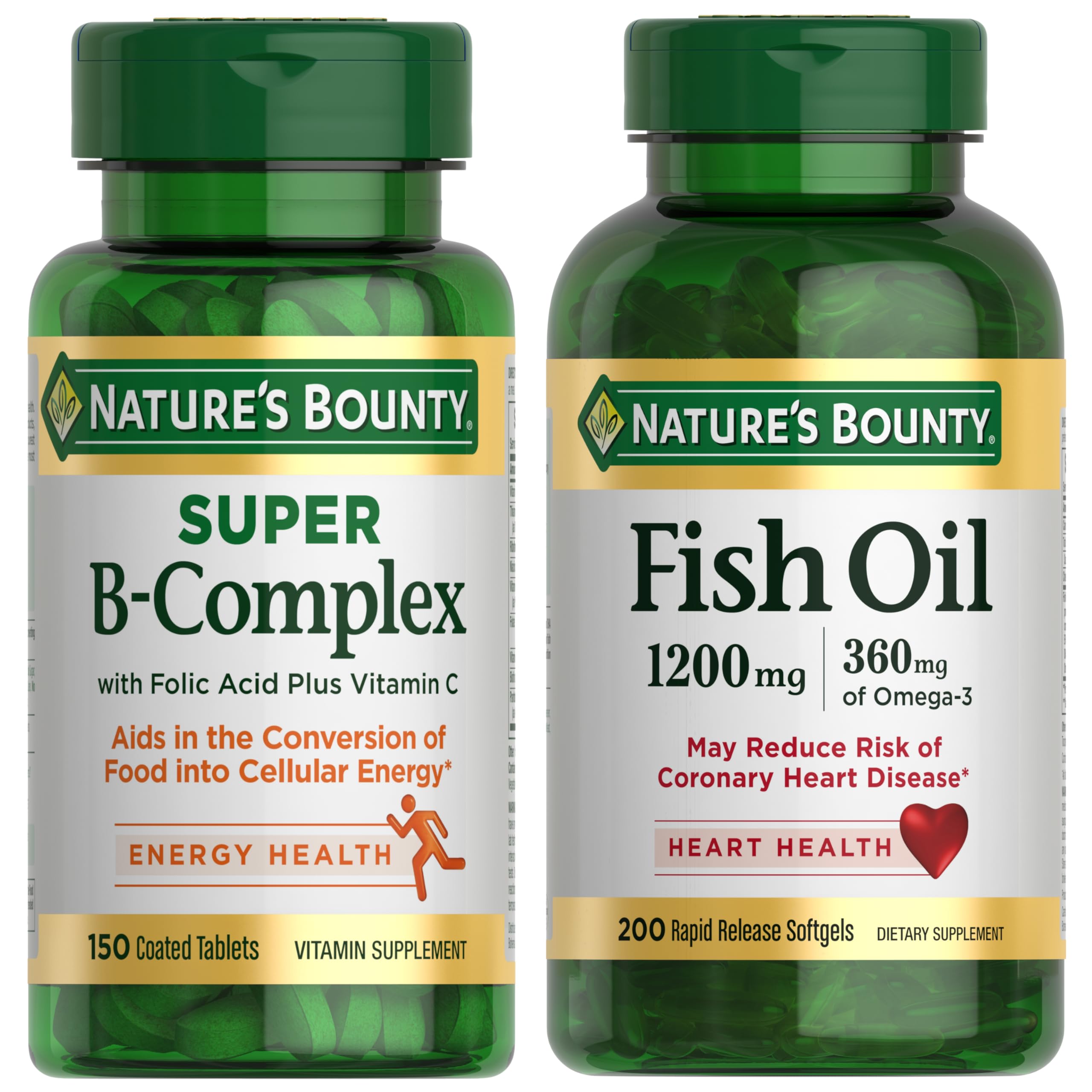 Nature's Bounty Energy & Heart Health Bundle: Super B Complex Vitamins with Vitamin C & Folic Acid (150 count) for Immune & Cellular Support + Fish Oil Omega-3 (1200 Mg 200 count) for Heart Wellness