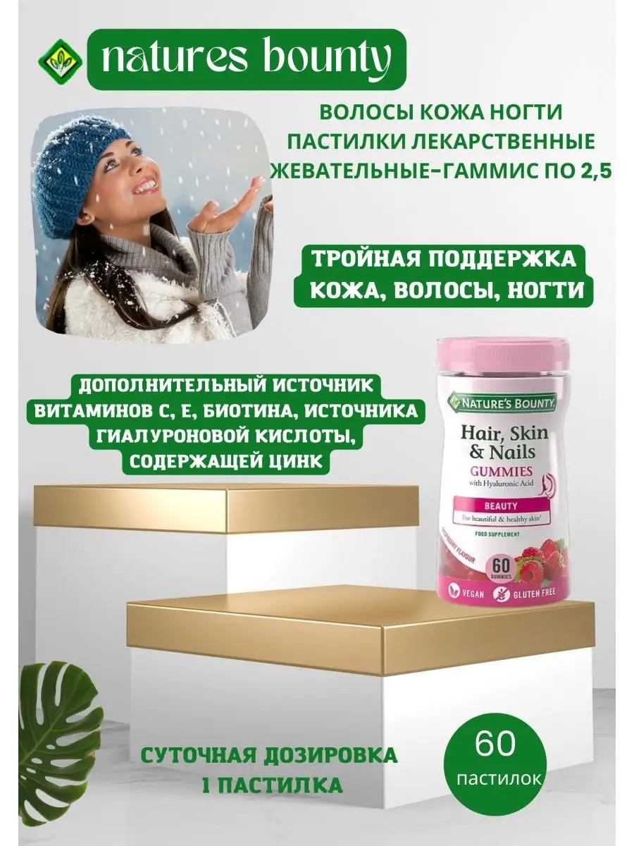 Нэйчес баунти Nature's Bounty ВОЛОСЫ КОЖА НОГТИ N60 ПАСТИЛКИ ЖЕВАТЕЛЬНЫЕ-ГАММИС/NATURES BOUNTY/ - Биологически активная добавка (БАД) к пищеРекомендуемый прием (1 паст.) содержит:Витамин С 20 мг % от рекомендуемого уровня суточного потребления: 33Витамин Е 5 мг ТЭ,% от рекомендованного уровня суточного потребления: 50Биотин 75 мкг, % от рекомендованного уровня суточного потребления: 150*Цинк 2 мг, % от рекомендованного уровня суточного потребления: 13а также:Гиалуроновая кислота 50 мг, % от адекватного уровня потребления: 100*не превышает верхний допустимый уровень потребления.Показанияв качестве биологически активной добавки к пище - дополнительного источника витаминов С, Е, биотина, источника гиалуроновой кислоты, содержащей цинк.Составсироп глюкозы, сахароза, декстроза, витаминно-минеральный премикс [(мальтодекстрин, L-аскорбиновая кислота, Dl-альфа-токоферол ацетат, сульфат цинка, D-биотин)], пектин (агент желирующий), дикрахмалфосфат картофельный (загуститель), гиалуронат натрия, лимонная кислота (регулятор кислотности), ароматизатор малина [(ягоды малины, пропиленгликоль (носитель), натуральные ароматические вещества, этиловый спирт)], красящий ингредиент [(концентраты моркови, черной смородины, инвертный сахарный сироп, лимонная кислота (регулятор кислотности)], растительное масло (кокос, рапс), карнаубский воск (глазирователь).Противопоказанияиндивидуальная непереносимость компонентов, беременность, кормление грудью, нарушения углеводного обмена.Перед применением рекомендуется проконсультироваться с врачом.Способ применения и дозыВзрослым по 1 пастилке в день во время еды.Продолжительность приема: 1 месяц.Особые указанияБиологически активная добавка (БАД) к пищеНе является лекарственным средством.Перед применением рекомендуется проконсультироваться с врачом.