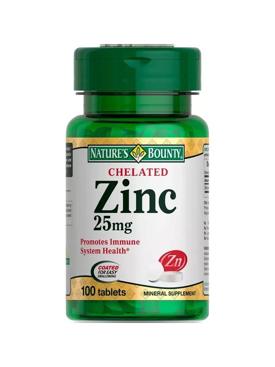 Нэйчес баунти хелат цинка 25 мг - это биологически активная добавка к пище, применяемая в качестве дополнительного источника цинка.Цинк выполняет в организме множество различных функций. В частности, достаточное поступление цинка помогает укрепить иммунную систему и поддержать ее работу на должном уровне, чтобы минимизировать риск простудных заболеваний. Цинк регулирует работу сальных желез, что важно для людей с проблемной и жирной кожей. Недостаток цинка может быть причиной угревой сыпи. Цинк играет важнейшую роль в процессах регенерации кожи, волос, ногтей. Также цинк поддерживает и укрепляет мужское здоровье. Он участвует в процессах сперматогенеза и синтеза тестостерона. Перед применением рекомендуется проконсультироваться с врачом.