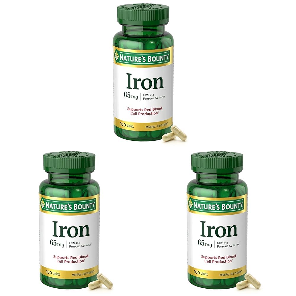 Nature s Bounty Iron 65mg 325 mg Ferrous Sulfate Cellular Energy Support Promotes Normal Red Blood Cell Production 1 Serving Per Day Gluten Free 100 Vegetarian Tablets (Pack of 3)