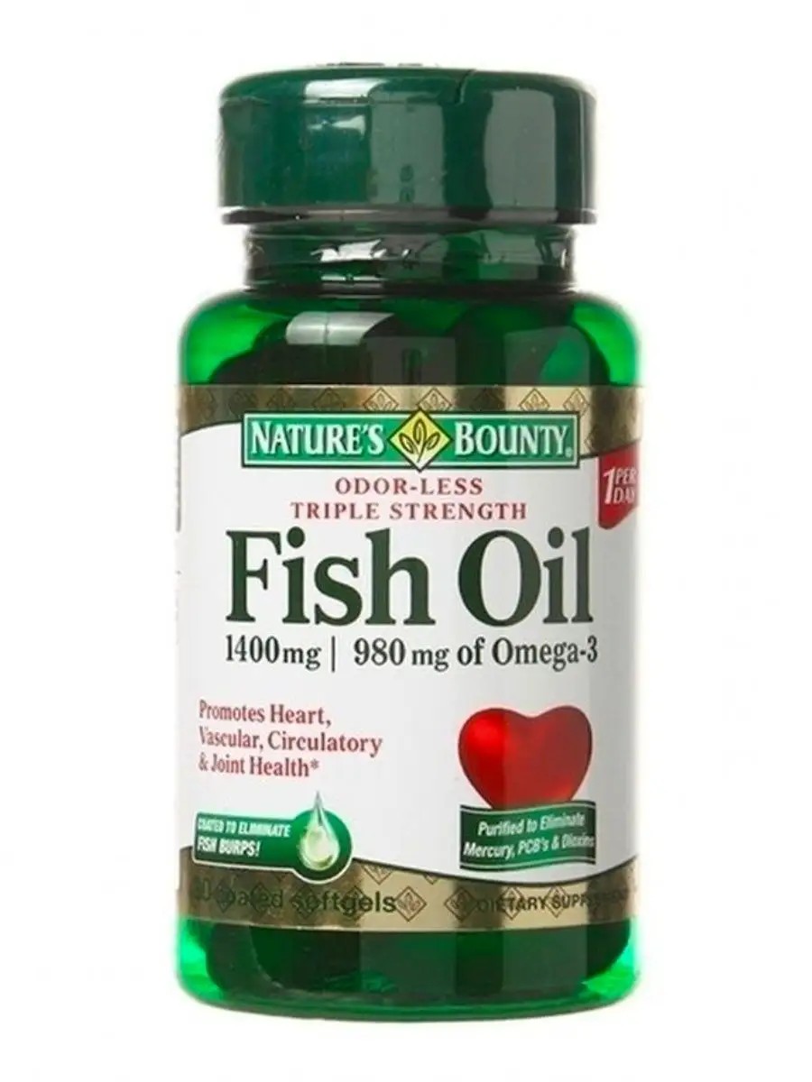 Nature's Bounty Рыбий Жир 1400мг Омега 3980 мг. Полиненасыщенные жирные кислоты (ПНЖК) Омега-3 являются незаменимыми веществами для нашего организма, и поэтому мы должны регулярно получать их с продуктами питания. Источником ПНЖК Омега-3 Nature's Bounty является филе диких холодноводных рыб (анчоус, макрель, сардина, сельдь). При этом важно содержание именно таких омега-3 ПНЖК, как эйкозапентаеновая (ЭПК) и докозагексаеновая (ДГК).