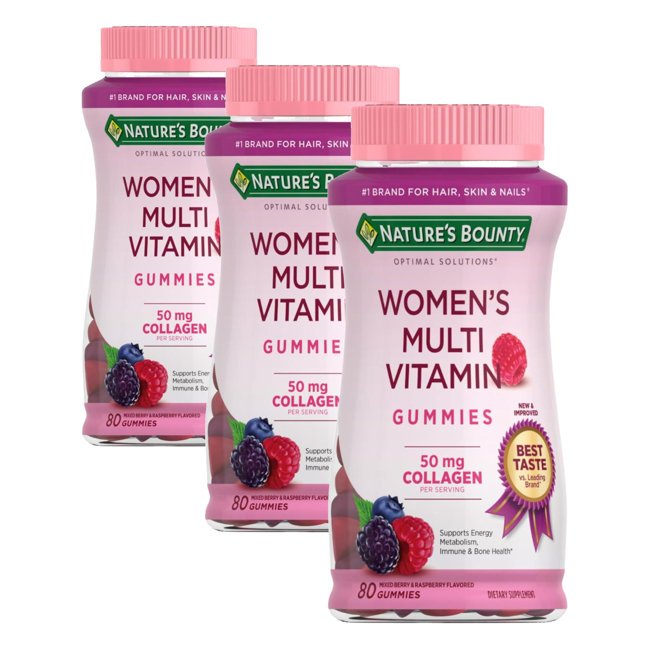 Raspberry-flavored daily vitamins for women include 50 mg of Collagen per serving. NATURE'S BOUNTY FOR SUPPORTING A HEALTHY LIFE: We carry a range of vitamins supplements including prenatal vitamins mood support joint support and supplements for healthy aging to help you maintain wellness at every stage of life (1). NATURE'S BOUNTY VITAMINS: Whether you're looking for overall wellness support or specific benefits we're here to help support your health goals Our vitamins and multi vitamins come in a variety of forms including gummies. GUMMY VITAMINS FOR ADULTS: Make your wellness routine better delicious gummy vitamins are a great way to make taking once a day vitamins easy and even enjoyable. MULTIVITAMIN FOR WOMEN: Chewable multivitamin gummies for women support wellness with key nutrients to support energy metabolism immune health and bone health (1). The information below is per-pack only.