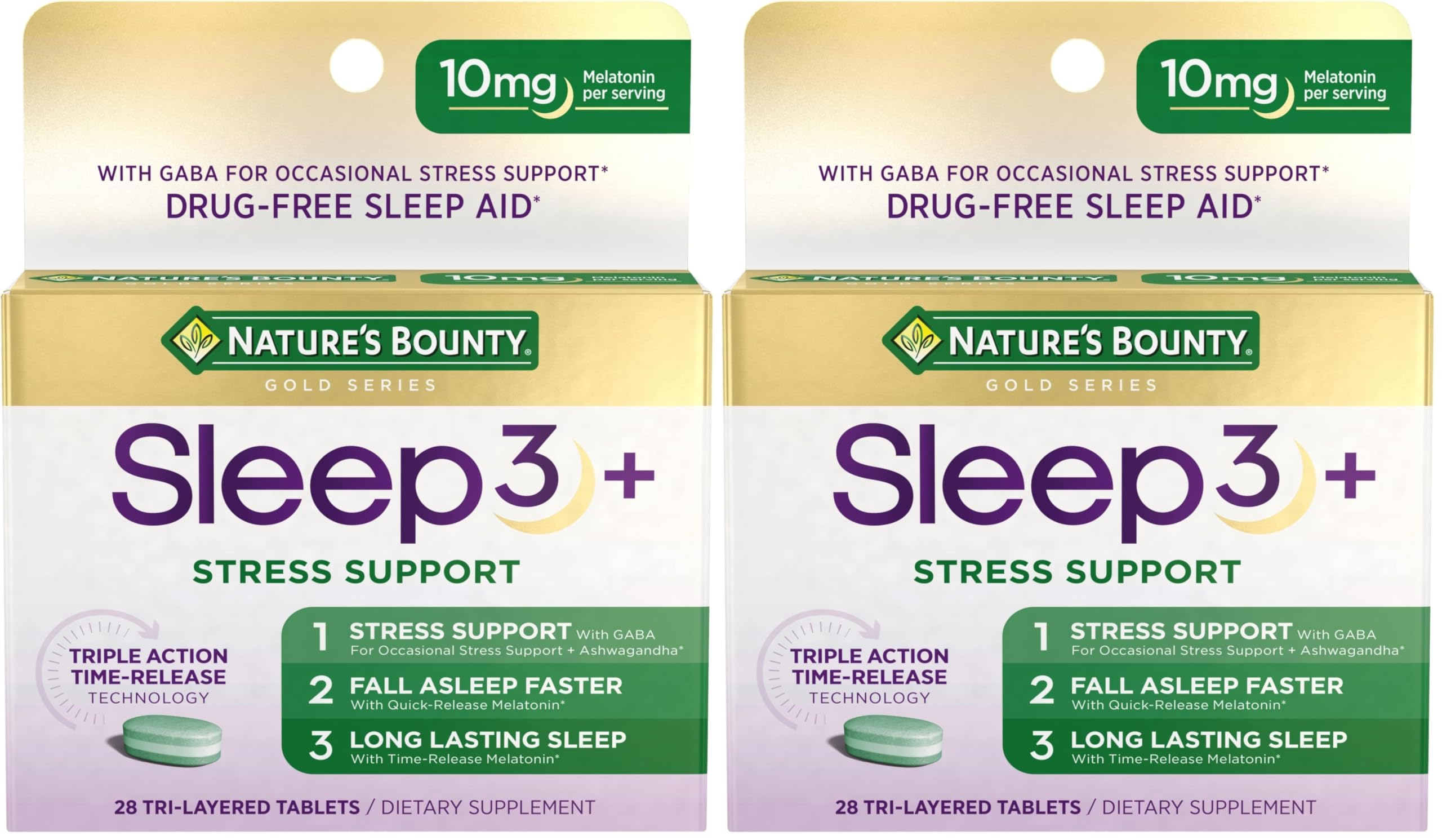 GUARANTEED QUALITY AND LABORATORY TESTED: Non-GMO, no artificial flavor or sweetener, no sugar, no milk, no lactose, no soy, no yeast, no fish. sodium free. Suitable for vegetarians. PLUS STRESS SUPPORT: Includes 100 mg of GABA, a natural stress aid, to help relax the mind and support occasional stress, plus 60g of Ashwagandha per serving. WITH 10 MG OF MELATONIN: Quick release melatonin helps you fall asleep faster, while time release melatonin helps you stay asleep longer by working with your body's natural sleep cycle, especially when experiencing occasional sleeplessness or jet lag. INNOVATIVE TIME-RELEASE TECHNOLOGY: Innovative tri-layer tablets with triple action time release technology. Each layer is dissolved at different times throughout the night to help you relax, de-stress, and get long-lasting sleep. 100 DRUG-FREE SLEEP AID: Nature's Bounty Sleep3 Stress Support is the first and only maximum strength tri-layer, 100 drug-free sleep aid that supports occasional stress. The information below is per-pack only.