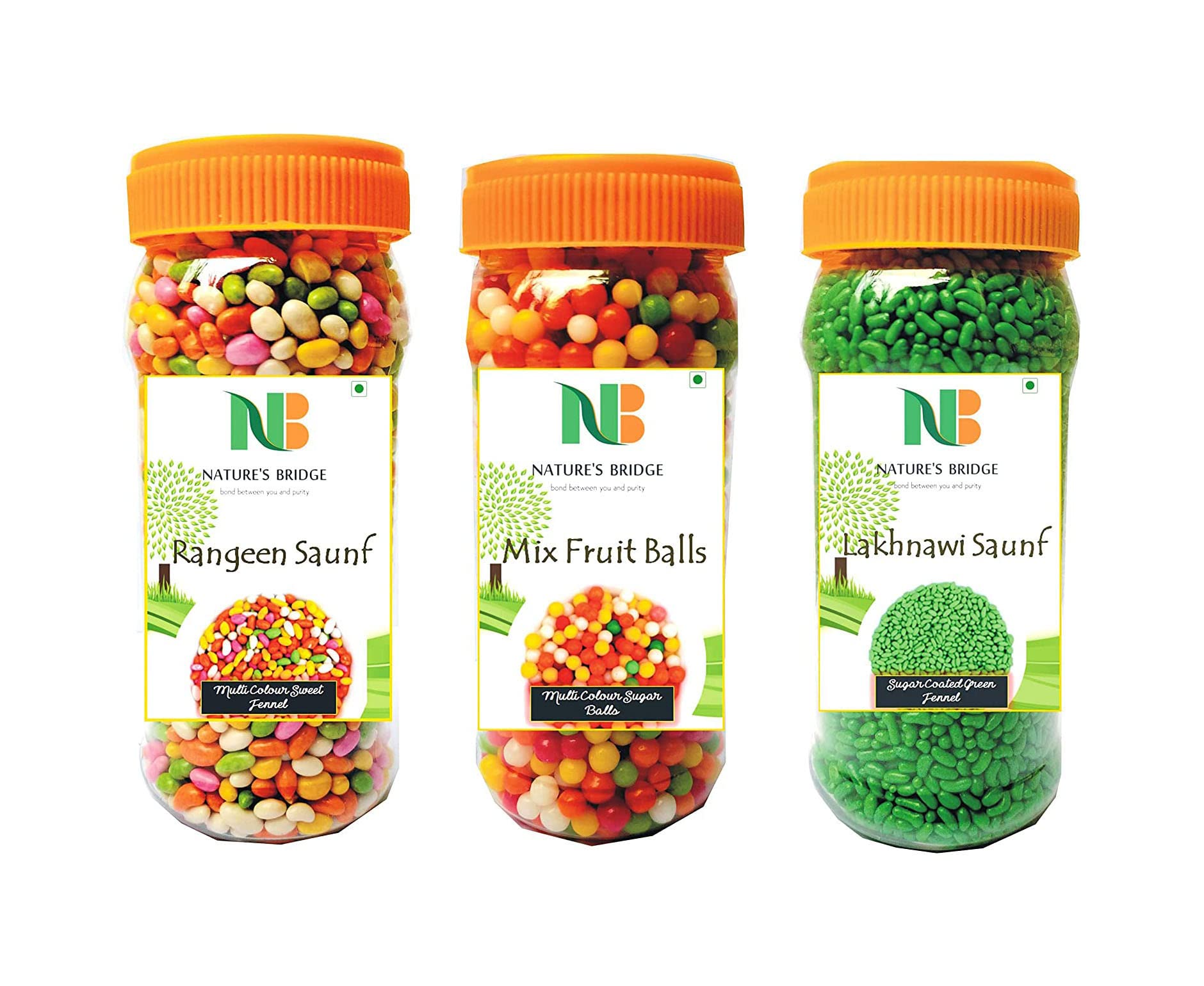 Nature's Bridge Rajasthani Mukhwas Combo Jar Pack of 3 / Multicolor Sweet Saunf Sugar Balls Lakhnawi Saunf Each 200gm / Sweet Fennel / Mouth Fresheners Combo (200 Gm X 3)_Packing May Vary