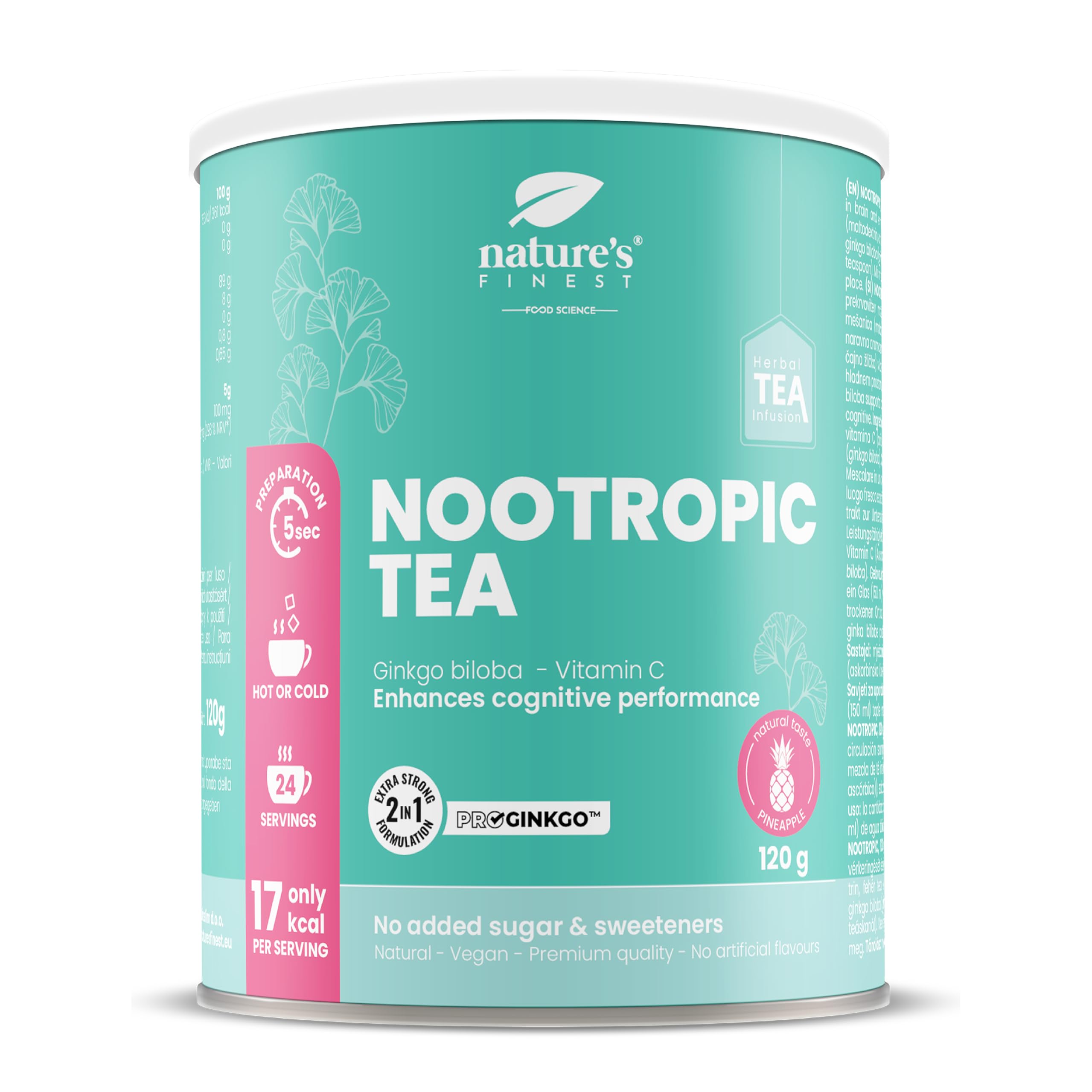 Discover the Delicate Blend of Nootropic Tea Looking for a tasty and practical tea for your daily life? Nootropic Tea is an herbal blend, combining Ginkgo biloba, Vitamin C, and white tea, designed to bring a refreshing touch to your days. Why Choose Nootropic Tea? - Delicate Flavor: A unique combination of herbaceous notes with the subtle sweetness of Ginkgo biloba and white tea. - Daily practicality: This instant tea is quick and easy to prepare, hot or cold, ideal for busy schedules. - For All: Perfect for herbal tea lovers and those who enjoy a drink inspired by nootropic supplements. - Sugar Free and Natural: A pure and refreshing alternative, without added sugars or artificial sweeteners. Premium Ingredients for a Superior Experience - Ginkgo biloba: Enjoyed for centuries in traditional herbal blends. - Vitamin C: Provides a touch of citrus while complementing the light and refreshing profile of the tea. - White Tea: Known for its delicate aroma and soft texture. How to Enjoy: Add 5 g (1 teaspoon) of instant tea powder to 150 ml of hot or cold water, mix and enjoy. Perfect any time of the day. For Who? - Those who enjoy herbal teas like ginkgo biloba herbal tea. - Those looking for a natural and tasty drink inspired by nootropic supplements. - Ideal for all ages, including seniors, as a daily calming drink. Treat yourself to the refreshing taste of Nootropic Tea. ADD TO CART now and enjoy a moment of calm and flavor! INGREDIENTS instant tea blend (maltodextrin, white tea extract (5 ), vitamin C (ascorbic acid)), pineapple flavor, ginkgo biloba extract (Ginkgo biloba).A BALANCED APPROACH – Made with no added sugar or artificial sweeteners, this natural blend fits easily into a balanced lifestyle routine. CONVENIENT AND QUICK – Simply mix 5g of powder into hot or cold water to enjoy an infusion ready in seconds. DELICIOUS AND NATURAL FLAVOR – With an exotic taste of pineapple and the delicate notes of white tea, this herbal tea transforms every cup into a unique sensory experience. INSTANT PLEASURE – This instant drink combines the natural freshness of ginkgo and the tangy touch of vitamin C, perfect for a revitalizing break. GINKGO BILOBA HERBAL TEA – AN INFUSION FOR YOUR WELL-BEING – Discover a herbal tea, prepared with ginkgo biloba, for a moment of relaxation in your daily life. Découvrez le Mélange Délicat de Nootropic Tea À la recherche d'un thé savoureux et pratique pour votre quotidien ? Nootropic Tea est un mélange à base de plantes, alliant Ginkgo biloba, Vitamine C, et thé blanc, conçu pour apporter une touche rafraîchissante à vos journées. Pourquoi Choisir Nootropic Tea ? - Saveur Délicate : Une combinaison unique de notes herbacées avec la douceur subtile du Ginkgo biloba et du thé blanc. - Praticité au Quotidien : Ce thé instantané est rapide et facile à préparer, chaud ou froid, idéal pour les emplois du temps chargés. - Pour Tous : Parfait pour les amateurs de tisanes et ceux qui apprécient une boisson inspirée des suppléments nootropes. - Sans Sucre et Naturel : Une alternative pure et rafraîchissante, sans sucres ajoutés ni édulcorants artificiels. Ingrédients Premium pour une Expérience Supérieure - Ginkgo biloba : Apprécié depuis des siècles dans les mélanges traditionnels à base de plantes. - Vitamine C : Apporte une touche d'agrumes tout en complétant le profil léger et rafraîchissant du thé. - Thé Blanc : Connu pour son arôme délicat et sa texture douce. Comment le Savourer : Ajoutez 5 g (1 cuillère à café) de poudre de thé instantané à 150 ml d'eau chaude ou froide, mélangez et dégustez. Parfait à tout moment de la journée. Pour Qui ? - Ceux qui apprécient les tisanes comme la tisane ginkgo biloba. - Ceux qui recherchent une boisson naturelle et savoureuse inspirée des suppléments nootropes. - Idéal pour tous les âges, y compris les personnes âgées, comme une boisson apaisante quotidienne. Offrez-vous le goût rafraîchissant de Nootropic Tea. AJOUTEZ AU PANIER maintenant et profitez d'un moment de calme et de saveur! INGRÉDIENTS mélange de thé instantané (maltodextrine, extrait de thé blanc (5 ), vitamine C (acide ascorbique)), arôme d'ananas, extrait de ginkgo biloba (Ginkgo biloba).UNE APPROCHE ÉQUILIBRÉE – Conçu sans sucre ajouté ni édulcorants artificiels, ce mélange naturel s'intègre facilement dans une routine de vie équilibrée. PRATIQUE ET RAPIDE – Mélangez simplement 5 g de poudre dans de l'eau chaude ou froide pour profiter d'une infusion prête en quelques secondes. SAVEUR DÉLICIEUSE ET NATURELLE – Avec un goût exotique d'ananas et les notes délicates du thé blanc, cette tisane transforme chaque tasse en une expérience sensorielle unique. UN PLAISIR INSTANTANÉ – Cette boisson instantanée allie la fraîcheur naturelle du ginkgo et la touche acidulée de la vitamine C, parfaite pour une pause revitalisante. TISANE GINKGO BILOBA – UNE INFUSION POUR VOTRE BIEN-ÊTRE – Découvrez une tisane à base de plantes, préparée avec du ginkgo biloba, pour un moment de détente dans votre quotidien.