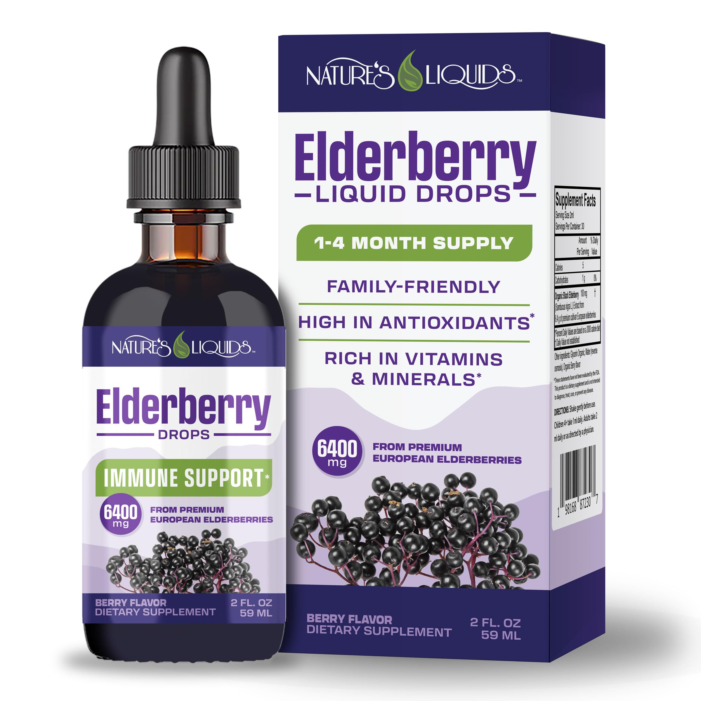 Nature's Liquids Elderberry Drops is a potent supplement that helps support your immune system and overall well-being. Specially formulated with the highest quality elderberry extract, each drop is packed with powerful antioxidants and nutrients to help keep you feeling your best. Elderberries have been used for centuries due to their remarkable health benefits, particularly in boosting immunity and fighting off colds. Our supplement harnesses the natural goodness of elderberries in a convenient liquid form, making it easy to incorporate into your daily routine. Nature's Liquids Elderberry Drops is carefully crafted to ensure maximum potency and effectiveness. We use only premium elderberry extract to make each drop packed with a concentrated dose of elderberry goodness, providing you with an efficient way to boost your immune system. In addition to its immune-boosting properties, elderberry is also rich in vitamins and minerals that support overall health. Our supplement is free from artificial additives and preservatives, making it a safe and natural choice.