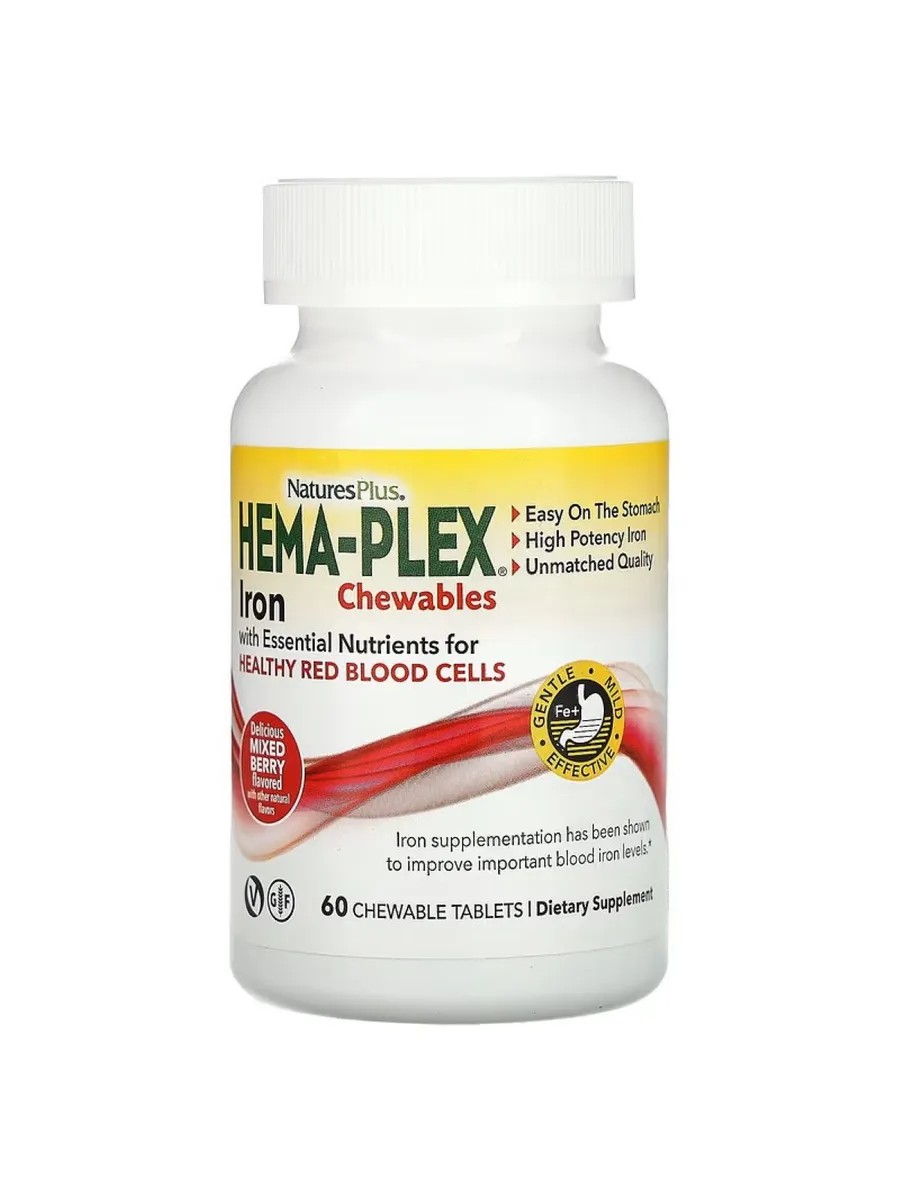 Natures Plus Hema-Plex (85 mg Chelated Iron), 60 Chewable Tablets is a pleasant and delicious way to improve or maintain the health of your circulatory system. Each serving of Hema-Plex, with its wonderful berry flavor, synergistically combines 85 mg of organically bound iron with effective plant cofactors that promote blood health and provide an energizing boost! It also helps increase hemoglobin levels. For 25 years, Hema-Plex has been considered one of the best products for raising iron and ferritin levels in the body. Natural ingredients, gluten-free. Directions: As a dietary supplement, take three tablets daily. Hema-Plex is the most absorbable iron chelate. Hema-Plex contains 85 mg of chelated iron—the most bioavailable form of iron for the body. Buying Hema-Plex to boost your iron levels is the best solution. Hema-Plex is a sustained-release iron supplement containing 85 mg of chelated iron. Pharmaceutical iron supplements typically contain 100 mg of vitamin iron, but only a small portion of this is absorbed. Hema-Plex is more than just iron; it's a complex of vitamins and minerals. Iron chelate is easier on the stomach than regular iron supplements. Iron deficiency can lead to: - Decreased performance - Fatigue - Weakness - Dizziness - Hair loss - Brittle nails - Pale skin.