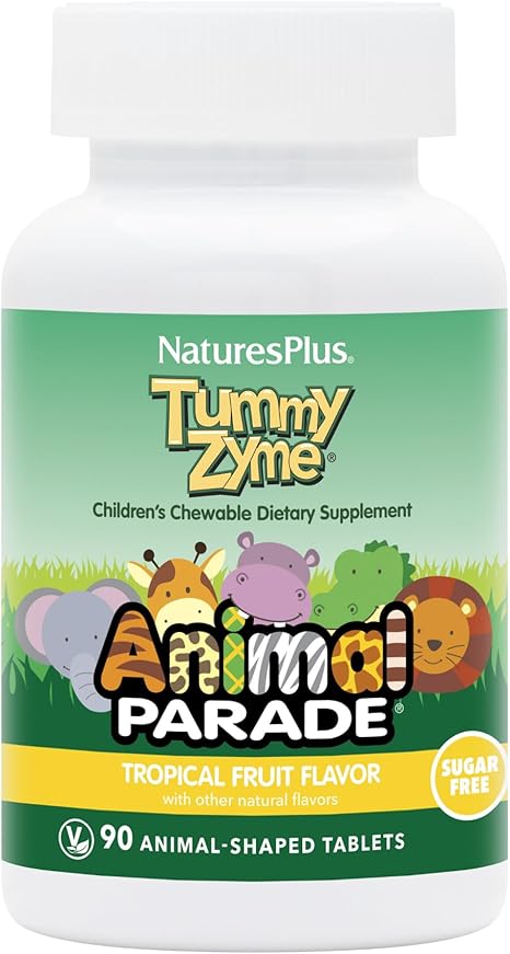 Animal Parade Children's Chewable Tummy Zyme is the complete natural digestive enzyme supplement kids love. With a delightful tropical fruit flavor, each fun, animal shaped chewable contains highly active food enzymes that help digest and liberate proteins, carbohydrates and fats. Powerful, yet gentle to the stomach, these digestive enzymes help to ensure that the wholesome nutrients in foods reach children's growing tissues, improving health and digestive comfort. Animal Parade Tummy Zyme further supports healthy digestion with an enzyme-rich whole food blend and live probiotics.