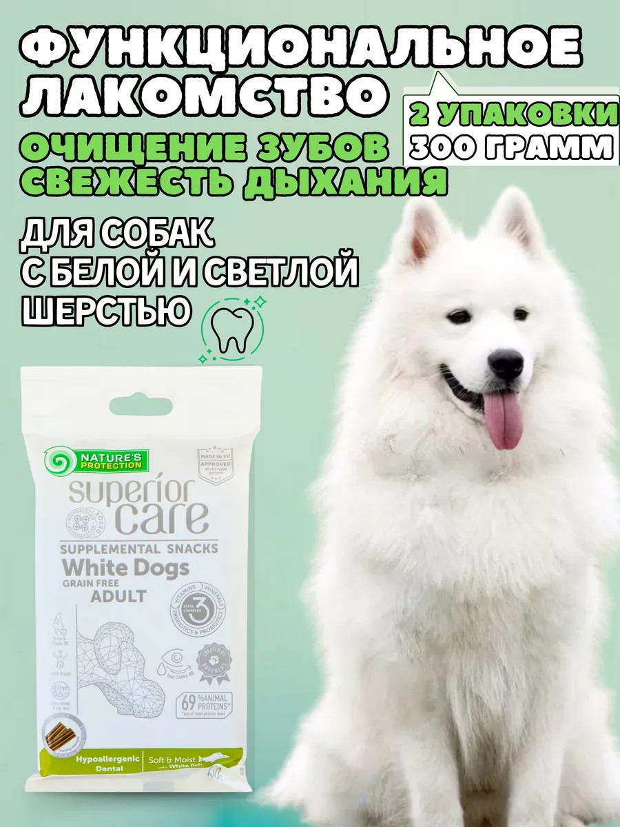 Natures Protection Superior Care White Dogs Grain Free Hypoallergenic & Dental — это кормовая добавка премиум класса, функциональное лакомство-вкусняшка, предназначенное для взрослых собак всех пород с белой или светлой шерстью. Эти жевательные палочки Натур Протекшен станут идеальным угощением для ваших четвероногих друзей. Благодаря оптимальном размеру лакомства подходят для мелких пород собак, а также для средних и крупных пород. Это гипоаллергенное лакомство, в составе нет сои, кукурузы и зерновых. Белая рыба — ключевой ингредиент, богатый источник Омега-3 и витаминов, легкоусваевымый белок с низким содержанием жиров, поэтому наши вкусняшки подходят для пожилых собак, питомцев с чувствительным пищеварением, а также для питомцев, склонных к аллергиям, набору веса и соблюдающих диету. Биотин (витамин Н) восстанавливает природный блеск волос, способствует здоровью кожи и шерсти. Таурин (taurin) это аминокислота, которая необходима для остроты зрения, работы сердечной, нервной и пищеварительной системы. Механическая чистка зубов в процессе жевания лакомства обеспечивает защиту от налета и камня, кариеса, освежает дыхание. Морские водоросли в составе содержат витамины А, С, К и В6, кальций, калий, медь, йод и марганец, эти элементы помогают укрепить организм, зубы и кости животного. Обладают антибактериальным свойством и помогают поможет избавиться от неприятного запаха из пасти у собак. Уникальная формула Tear Stains Off — помогает сделать слюну и слезы прозрачными, тем самым борясь с появлением коричневых слезных пятен у белых собак, возникающих вокруг глаз, рта, лап или других частей тела питомца. Благодаря компактной и удобной упаковке снеки можно взять с собой в дорогу или на прогулку, либо использовать в качестве поощрения и награда для собак при дрессировке.