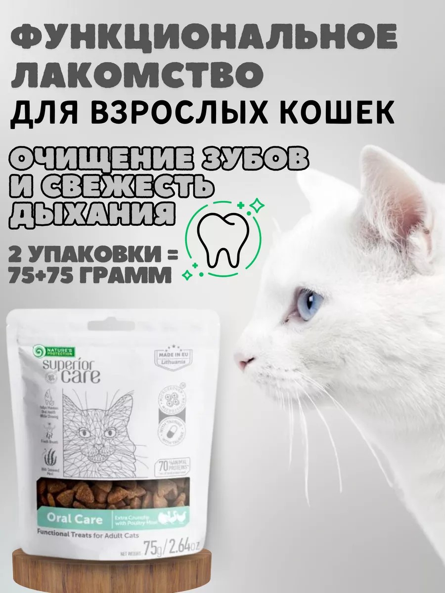 Natures Protection Superior Care Adult Oral Cat (Птица) — это кормовая добавка высочайшего качества, предназначенная для взрослых кошек и котов. Данное функциональное лакомство Натур Протекшн — идеальный выбор, чтобы проявить любовь к вашей кошке и в то же время обеспечить ее ежедневной дозой необходимых витаминов, минералов и пребиотиков. Если ваш питомец не любит чистить зубы щеткой — попробуйте наше лакомство для чистки зубов у кошек. Никогда еще чистка зубов котам не была такой легкой! Эти закуски для кошек содержат морские водоросли, которые помогают поддерживать надлежащую гигиену полости рта вашей кошки. Особая форма снеков способствует тщательному их пережевыванию. Применение лакомства уменьшает образование зубного налета и зубного камня, уменьшает неприятный запах изо рта кошки, а также поддерживает иммунитет и помогает укреплять зубы и кости вашей кошки.