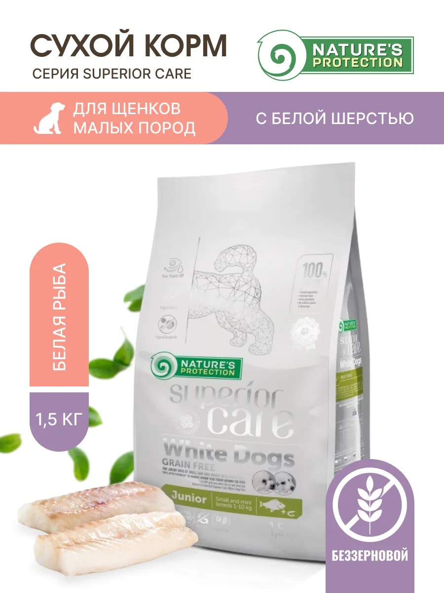 NATURE'S PROTECTION SUPERIOR CARE сухой беззерновой корм для собак мелких и мини пород с белой шерстью, с белой рыбой.