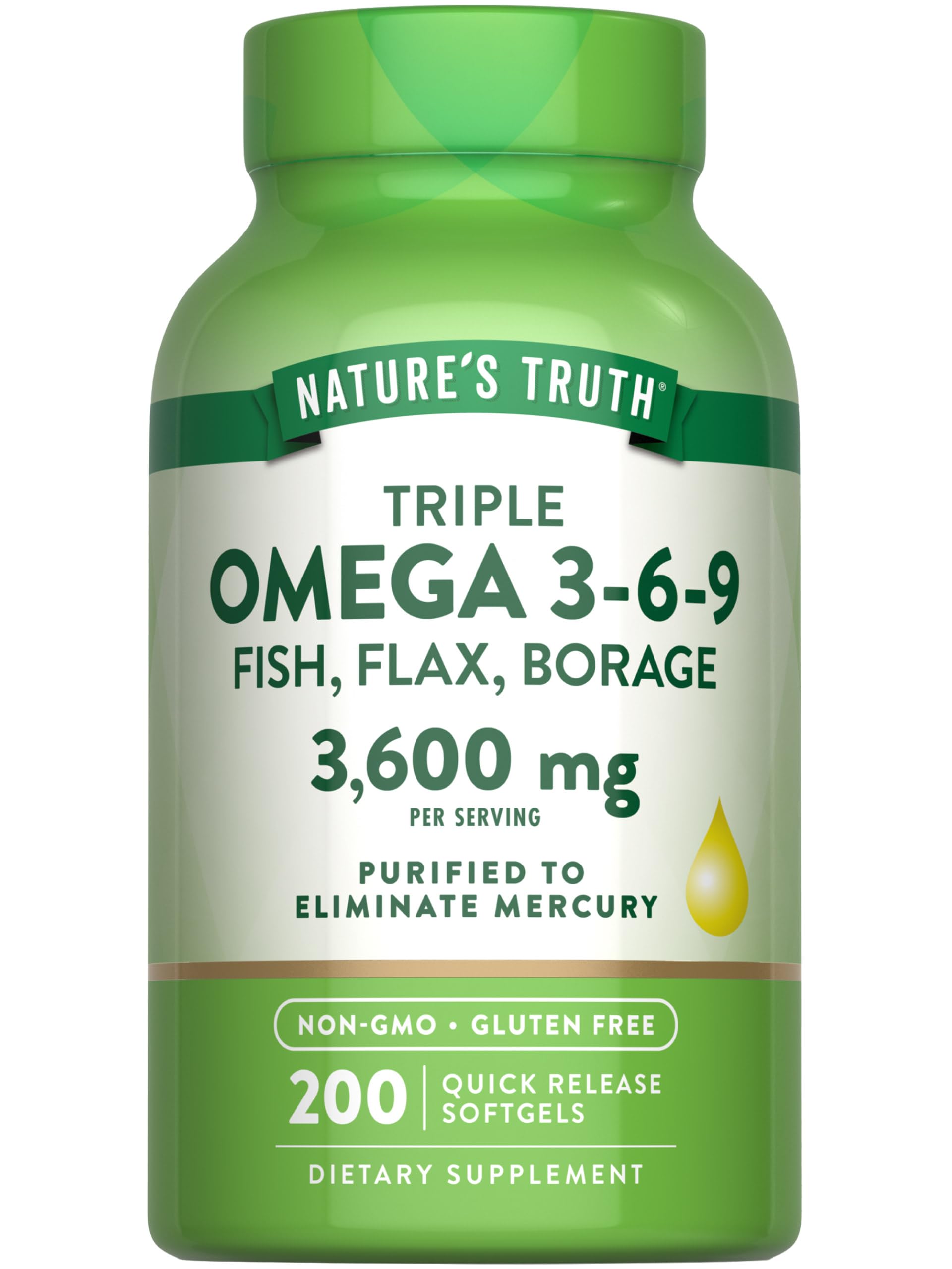 Nature's Truth Triple Omega 3-6-9 Softgels offer support from purified fish oil, flaxseed oil, and borage oil, providing omega-3, omega-6, and omega-9 fatty acids. These convenient quick release softgels are purified to eliminate mercury, delivering the beneficial omegas you're looking for.