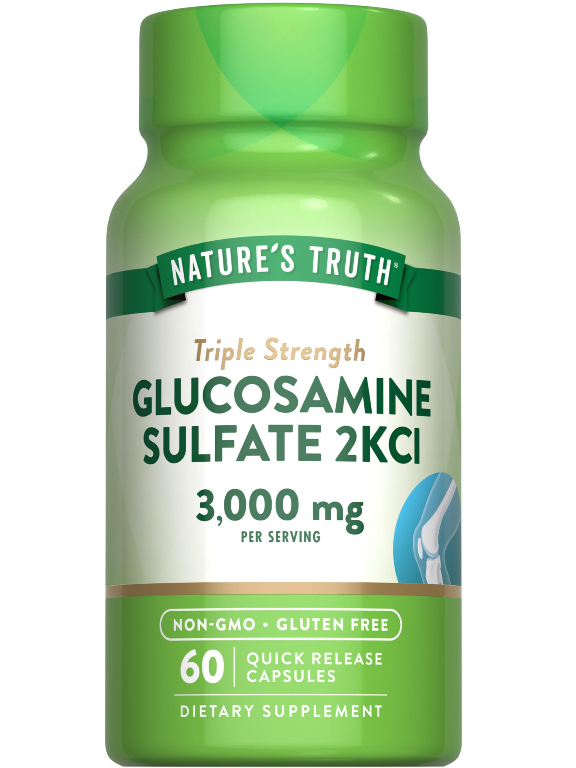 NATURALLY FREE OF: Gluten, Wheat, Milk, Lactose, Soy, Artificial Sweetener Flavor, and Non-GMO. EXPERTS YOU CAN TRUST: Backed by three generations of Vitamin Innovators for unrivaled quality. HONEST TRANSPARENT: Nature's Truth is committed to delivering the best quality wellness products. TRIPLE STRENGTH: Each serving delivers 3,000 mg of Glucosamine Sulfate 2KCl 350 mg of Potassium. GLUCOSAMINE: A natural compound found in cartilage, bones, and joints.