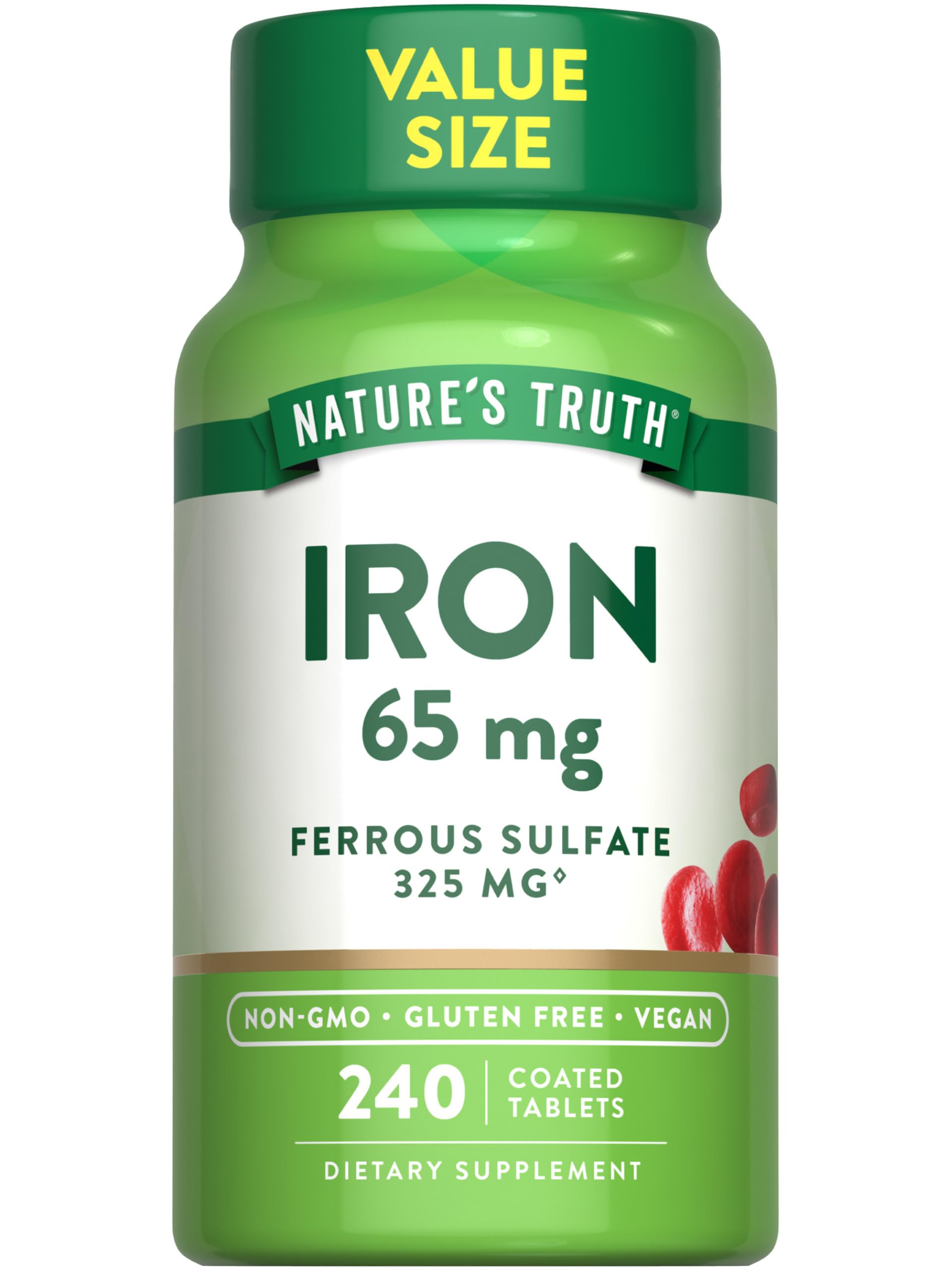 What Is Iron? Iron is an essential mineral that the body needs each day but cannot produce on its own. Iron can be found in many foods such as spinach, red meat, and legumes however, it can be challenging to get the recommended daily intake of Iron from food sources alone. A high-quality Iron supplement is a reliable way to incorporate this key mineral to your daily routine. Nature's Truth Iron Tablets These Iron Tablets deliver 65 mg of Iron, as Ferrous Sulfate, in each serving. One vegan coated tablet per day is all men and women need to meet their recommended daily value of this essential mineral. This value size bottle of 240 tablets will last for several months! Combine quality with quantity and add this formula into your daily routine. Nature's Truth: Where Wellness Begins Our mission at Nature's Truth is to meet your wellness needs with products that go above and beyond. Nature's Truth provides supplements in various delivery forms, such as capsules, softgels, chewables, tablets, powders, liquids, and gummies to suit every preference. Our Iron supplement is vegan, non-GMO, and free of gluten, wheat, yeast, milk, lactose, artificial flavor, and preservatives.
